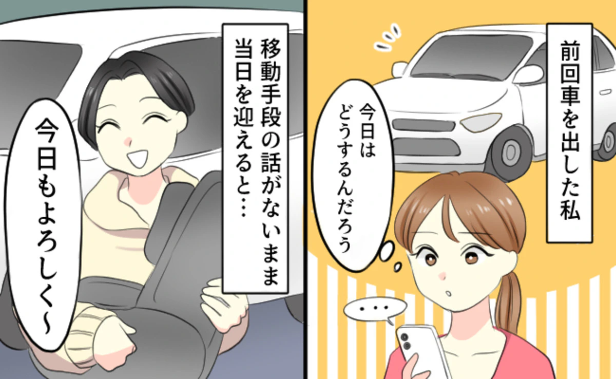 数週間後、また遊びに誘われた時のこと。移動手段の話にならないまま当日を迎えました。 『今日はどうするのかな?』と内心ソワソワしていると、頼子ちゃんは当たり前のような顔で、自分の家のチャイルドシートを抱えて私の車の前に立っていました。