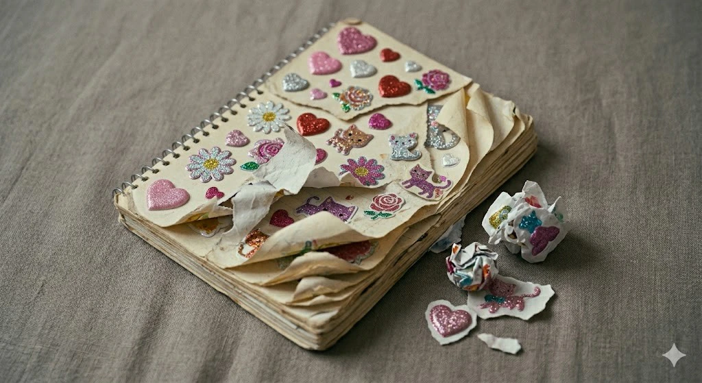 変わり果てたシール帳の姿に、言葉をうしなった方も多いのではないでしょうか。丁寧に貼られた思い出を、力まかせにはがし、やぶり捨てる…。その行為に込められたおさない悪意は、シールの代金以上におもいものです。