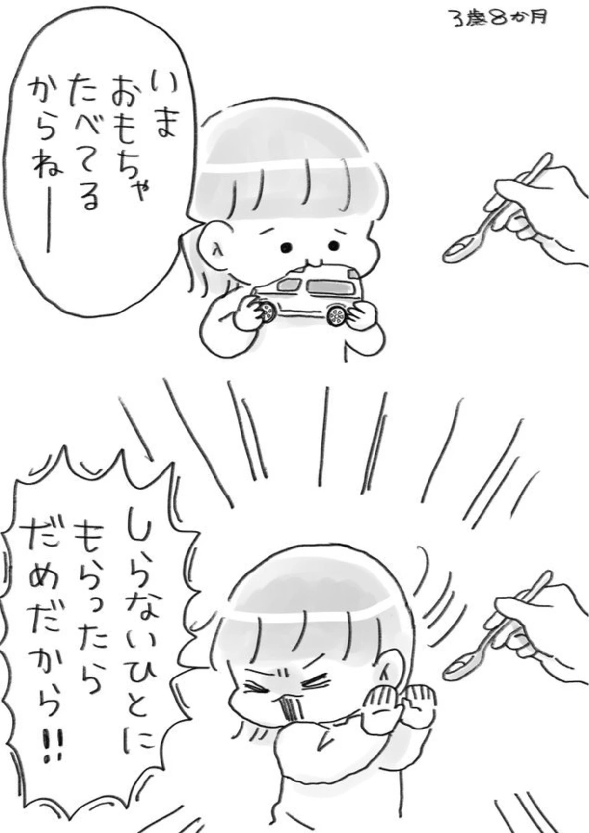 娘さんの「今おもちゃ食べてるからねー」「知らない人にもらったらだめだから!」という大胆な言い訳に、思わず吹き出してしまいました。周囲の大人から学んだのかなあと感じられる言葉に感心です。