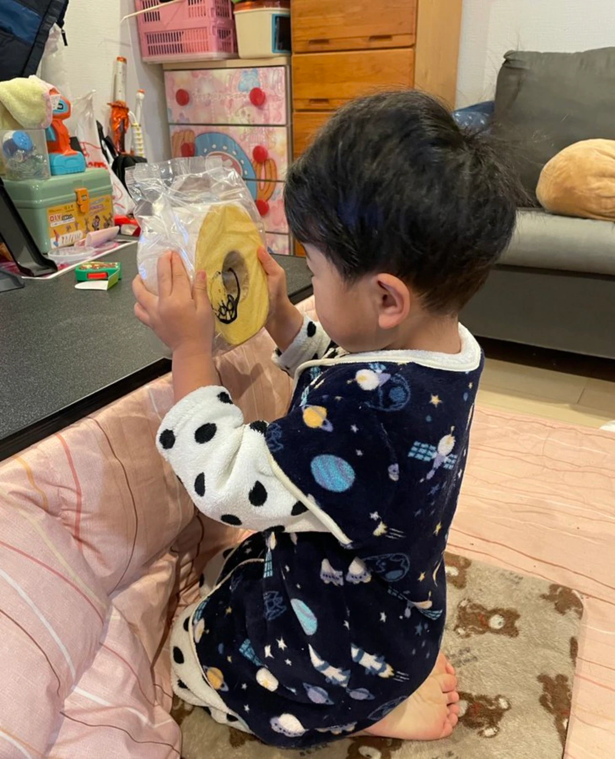 バームクーヘンといえば皆さんご存知の通り、最初から真ん中にぽっかり穴が空いているお菓子ですが、3歳児にとっては、真ん中がない=誰かが食べたという認識なのでしょうか。そして、その犯人はいつも『パパ』。「また真ん中食べたなぁ〜」が、かわい過ぎてじわじわと笑いを誘いますね。子どもの発想は、なぜこんなにも愉快で愛おしく、何度思い出しても笑えてしまうのでしょうか。