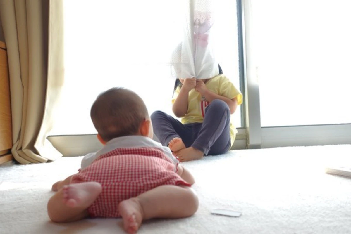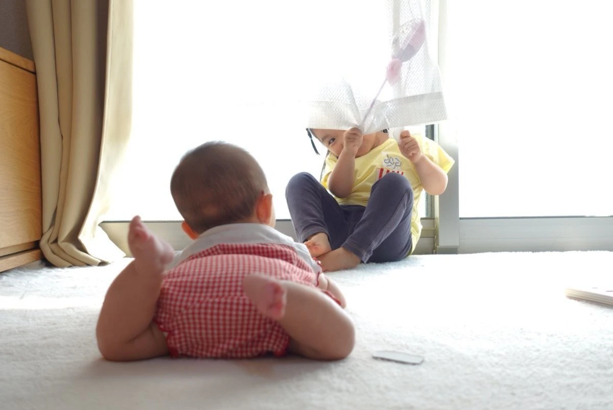 2歳と0歳のかくれんぼ、非常にかわいい ※2