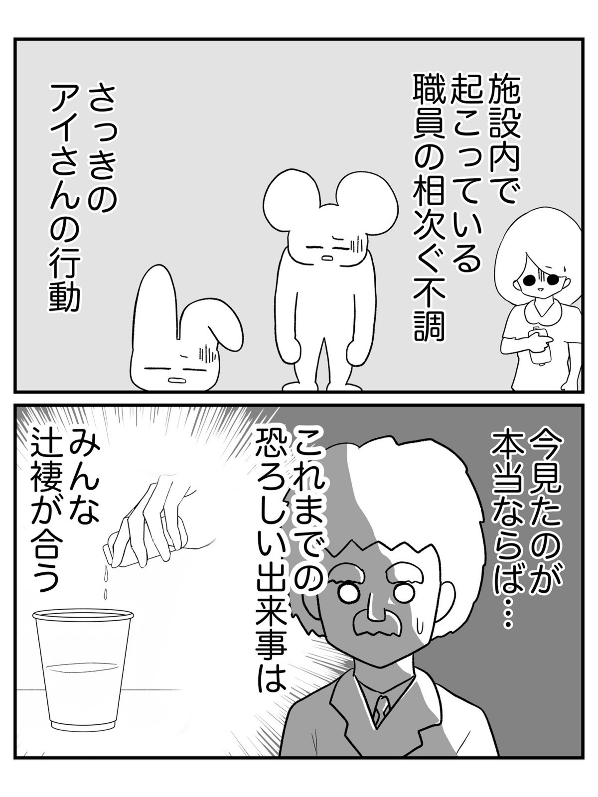 ついに施設長が、アイが飲み物に何かを混入させる場面を目にしました。