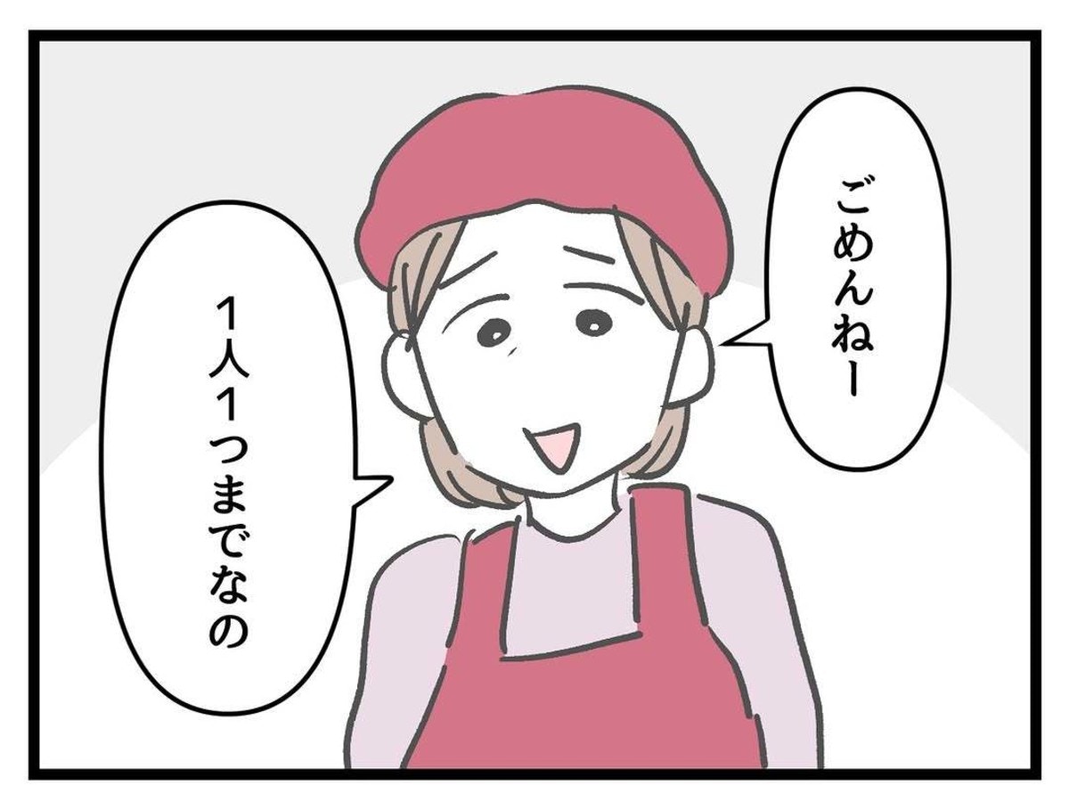 店員さんに1つまでと言われ、駄々をこねるたまみ。しかしお店も商売なので何個も同じお客さんにあげられませんよね。