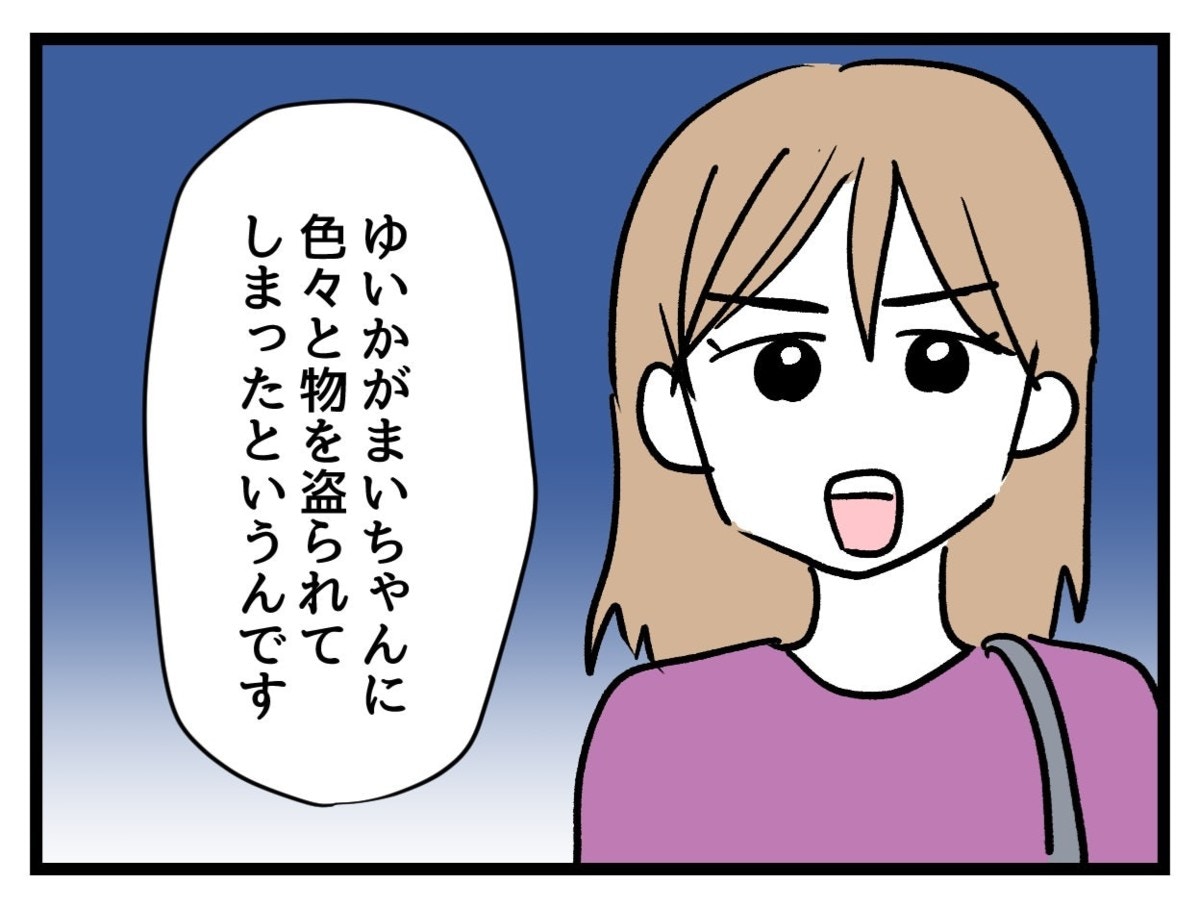 まいにものを盗られたと主張するゆいかの母親。しかも、「いろいろと」と言っているということは1つではないようです。まいはいったい何を盗ったのでしょうか。