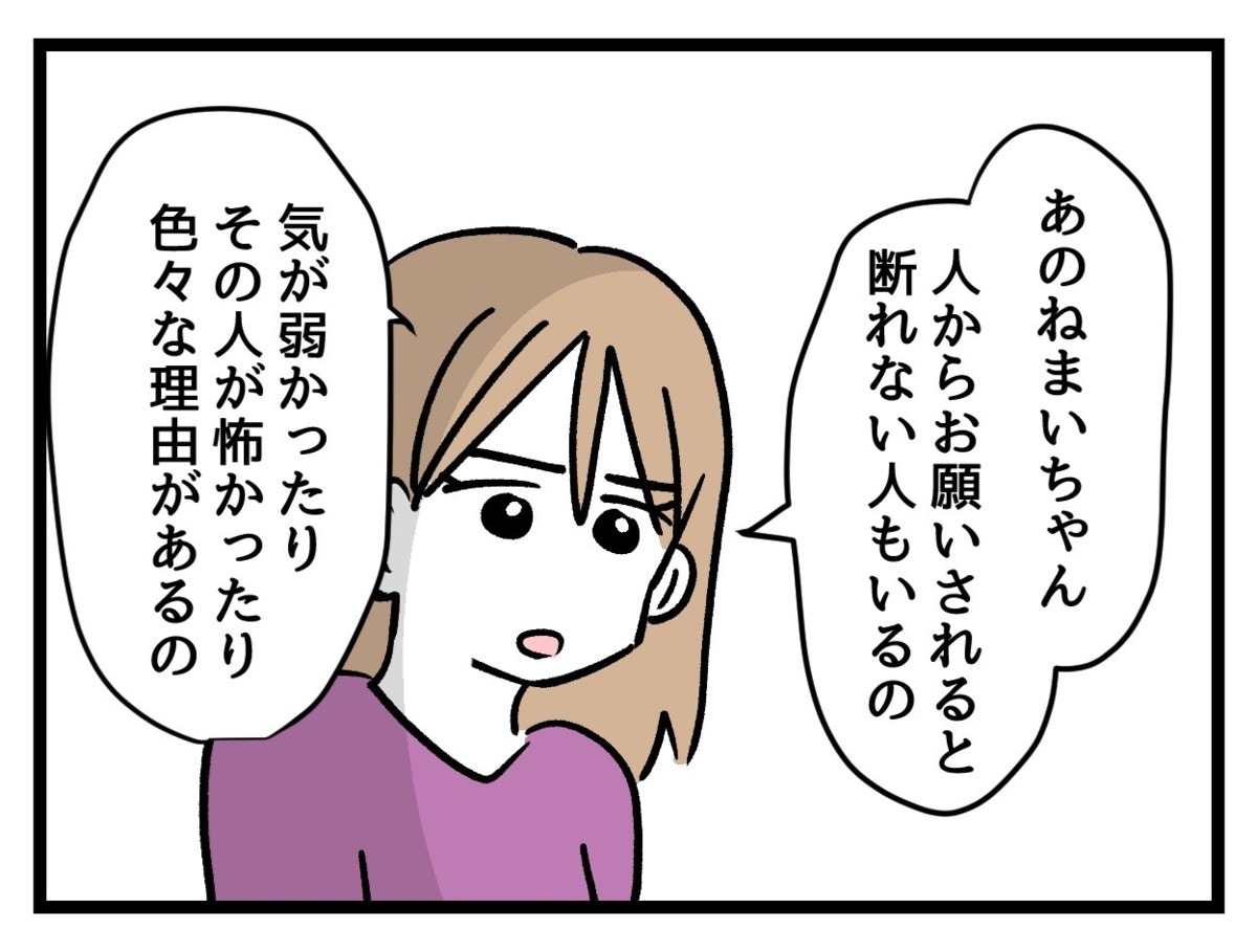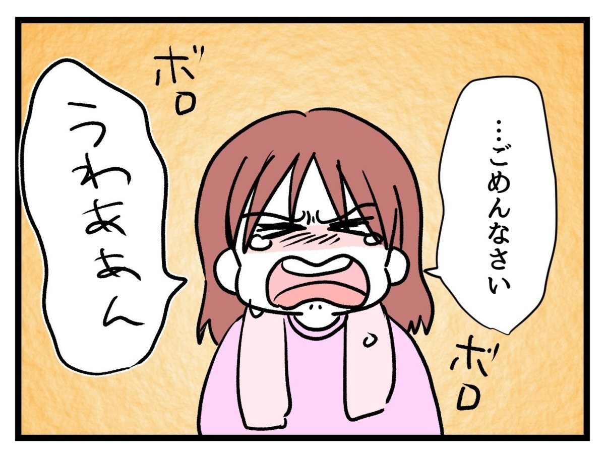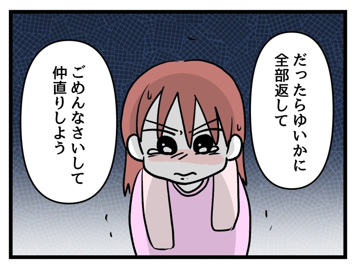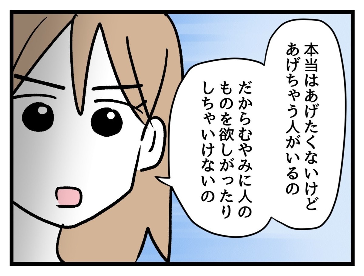 自分が悪いことをしてしまったと気づいたまいは、泣きながらも素直に謝ります。まい自身、本当に「ちょうだい」と言ったらもらっても大丈夫なのだと信じていたのかもしれません。母親からの教えを信じて守ってきたたまみのように…。