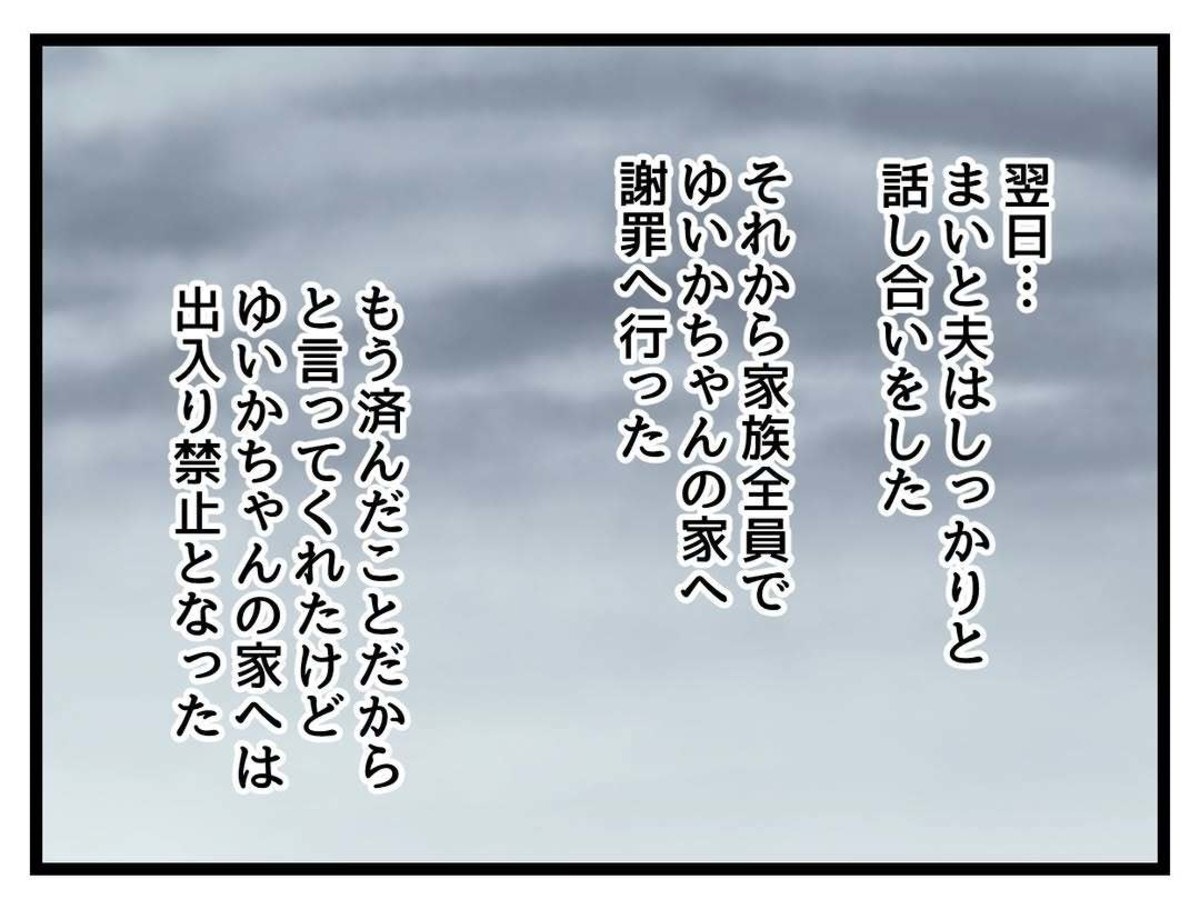 夫に自分を見つめ直すよう言われ、心から反省するたまみ。まいは夫と話し合いをし、家族でゆいかの家に謝罪に行きました。出入り禁止になったことはやってしまったことを考えると当然ですが、きちんとけじめをつけたことでたまみたち家族としても新しいスタートを切れそうです。