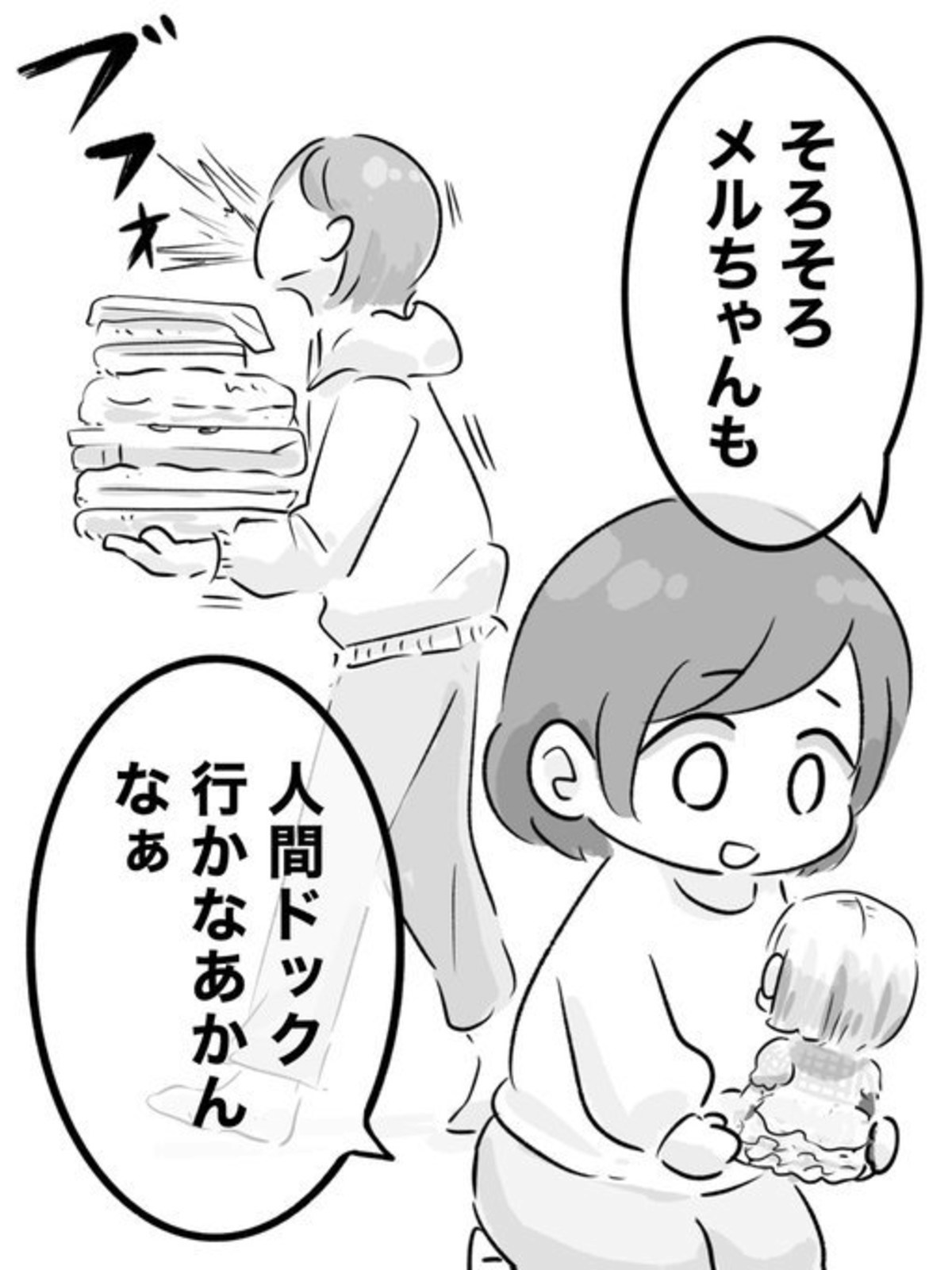 メルちゃんに「そろそろメルちゃんも人間ドックいかなあかんなぁ」と声をかける娘さん。メルちゃんにはまだ早いよ…と思わず笑ってしまいました!意味を知ってか知らずか、周りの大人やテレビ番組などから聞いて口にしたのでしょうね。よく会話を聞いているんだなあと驚きですね。