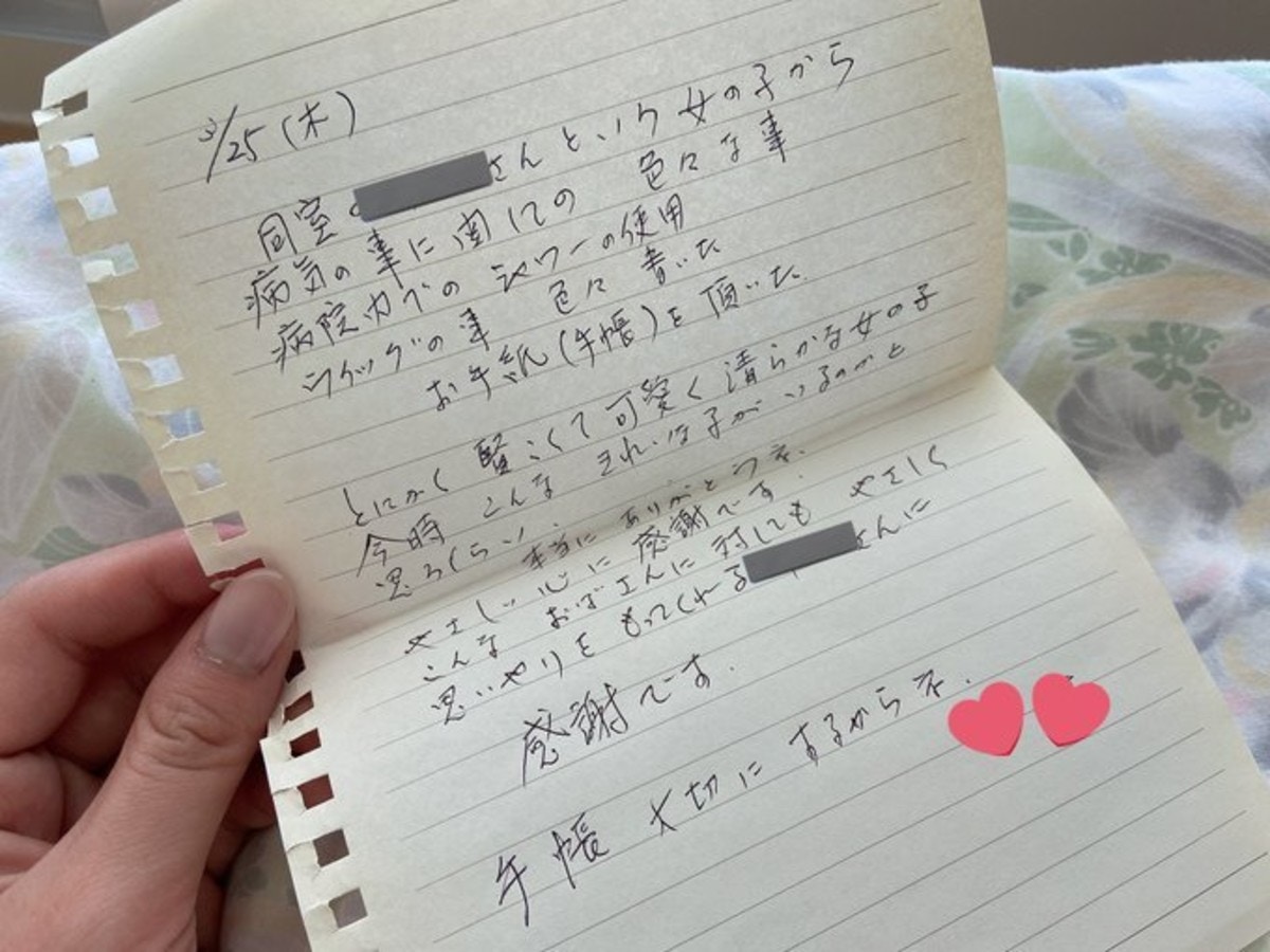 投稿者・かな@悪性リンパ腫と乳がん(@kananan_95)さんは、入院中に同室だったおばあちゃんが、不安を看護師さんに吐露しているのを耳にします。食べやすかったもの、ウィッグのことなど、経験をメモにまとめて渡したところ、退院日に手紙を受け取ったのだそう。温かなエピソードにほっこり。