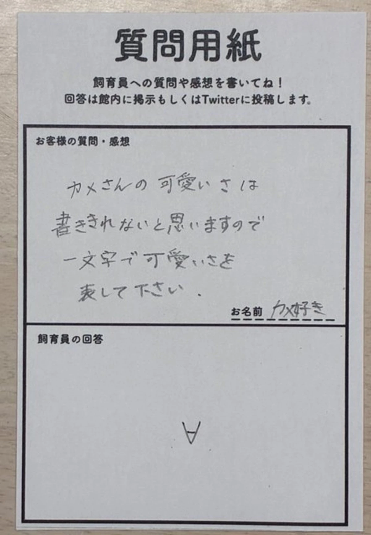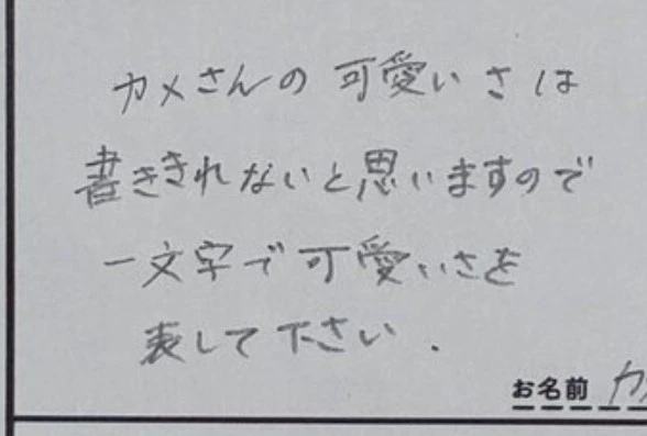 度々飼育員さんへの質問や感想に回答をしている、道の駅ウミガメ公園【公式】(@umigame_kouen)さんは「1文字でカメのかわいさを表してください」というリクエストに“∀”と回答。口やカメの尻尾にも見えますが、その意図に反響が寄せられました。カメ愛が伝わる回答にほっこり。