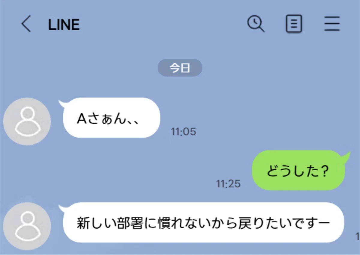 内容は、「新しい部署に慣れないから戻りたいですー」みたいな内容を仕事中に送ってきていたみたいです。