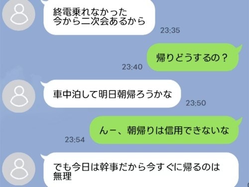 先程終電乗れなかった、今から二次会、とLINEがありました。