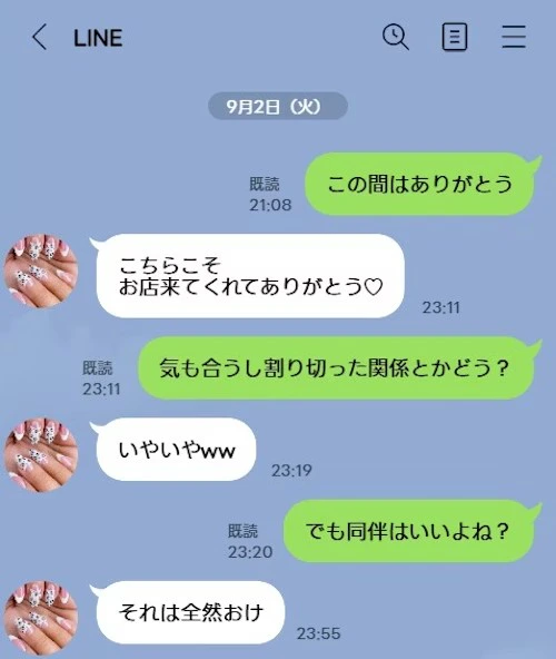 その後LINEで女の子に「割り切った関係であそぼう」と体の関係を誘っており女の子には断られ、2ヶ月先の同伴の約束をしてLINEを終了していました。