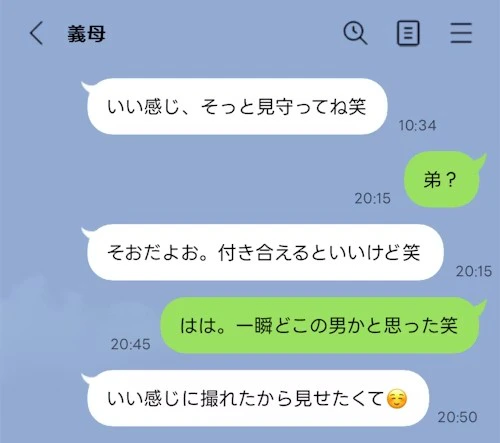 LINEは便利な一方、ついイライラしてしまうこともありますよね。この記事では、義母からのLINEに困っているという投稿を紹介します。仕事中、義母から顔を隠したカップルのような写真が来て驚いたという投稿者さん。画像とともに来たのは「いい感じ、そっと見守ってね笑」という文面。冷静に考えてみるとそれは義母と義弟のツーショットだったそうなのですが、仕事中の嫁にわざわざ送ってくる内容にしてはくだらなすぎて、うんざりしてしまったそうです。