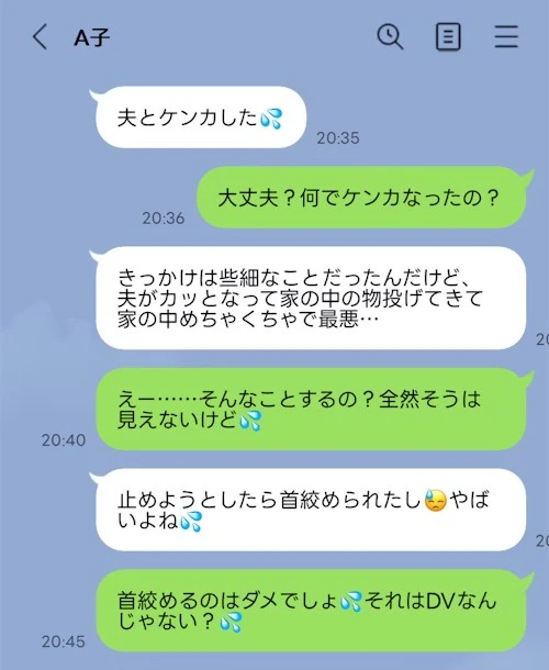 話しやすく、人なつっこいタイプだという、友だちの夫。しかし、子どもを叱る時に頭を叩いたり、友だちに対しては物を投げたり、首を絞めたりと、暴力的な面もあるそう。そういった行動は、DVやモラハラだと投稿者さんは思っているものの、友だちはそこまでは思っていない様子です。友だちの夫の裏の顔に、「これが典型的なDV男なのか」と思ってしまったそうです。