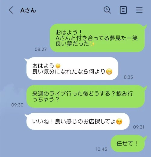 夫からおはよー!って送ってて、ほぼ毎日やりとりしてます。内容は他愛もないことですが、2人で飲みに行ったり今度ライブに行くと言ってましたがその女と一緒に行くようです。決定的な不倫の内容はないですが、「〇〇と付き合ってる夢見たー笑」「いいね教えてくれてありがとう」みたいなやりとりもあり気分悪いです