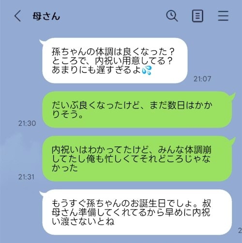 すると、義母から夫に「内祝い用意してる?あまりにも遅すぎるよ」と催促のLINEが…。