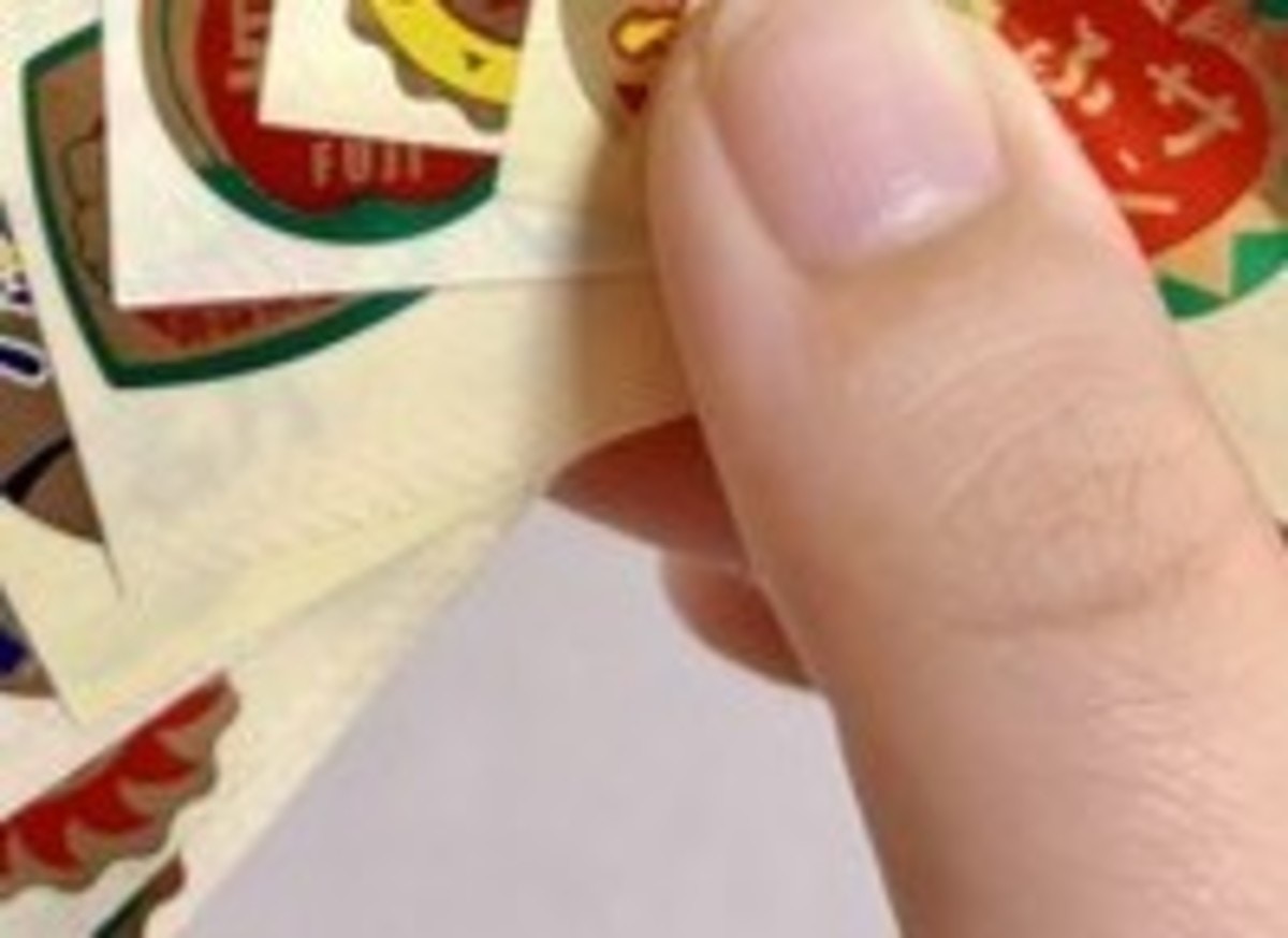 まさかの「りんごの品種」シール。スーパーでよく見かける、小さくてカラフルでちょっとツヤっとしたあの丸いシールです。いろいろな種類があってかわいいですね。