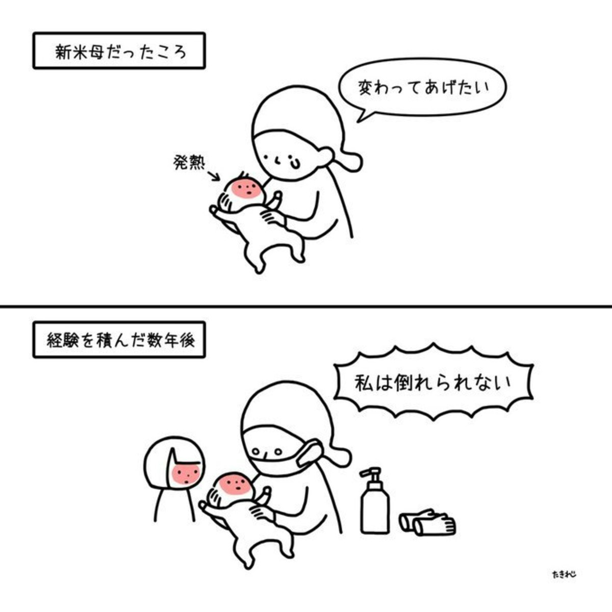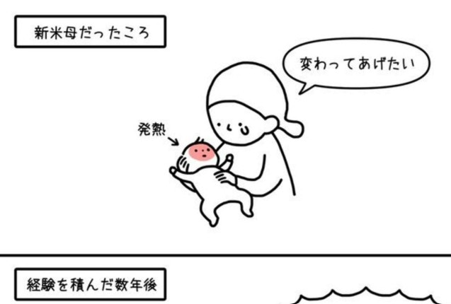 新米母のころは、発熱した赤ちゃんを抱えながら「変わってあげたい」とつらい気持ちに。精一杯だった、あのころ。しかし育児の経験を積んだ数年後、再び発熱した子どもたち。消毒や看病、やることは山ほどあるのです。そして母の言葉は変わる。「変わってあげたい」から、「私は倒れられない」。子どもの体調不良はつらいですよね。でも、それ以上に怖いのは自分が動けなくなることです。守る側が倒れることの重みを痛感します。