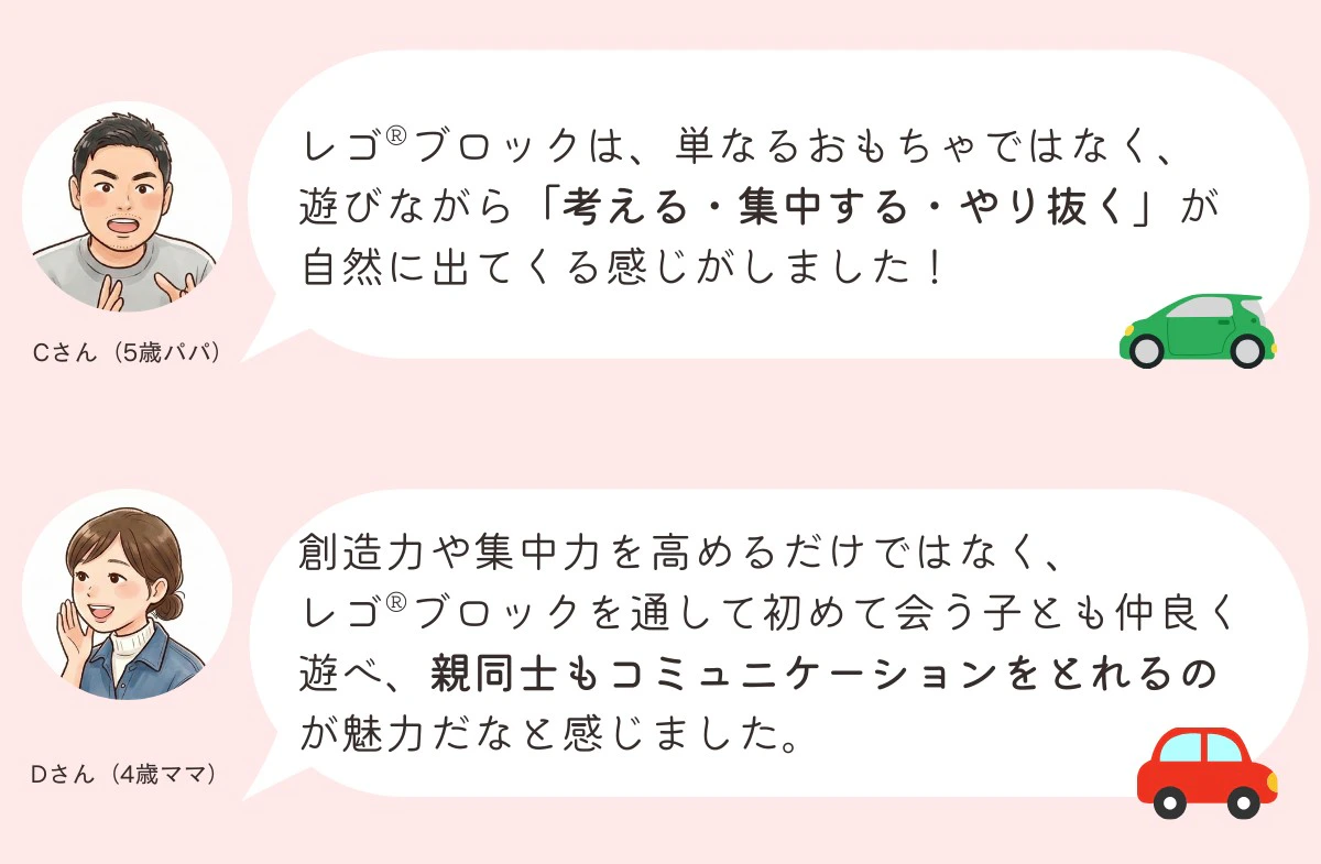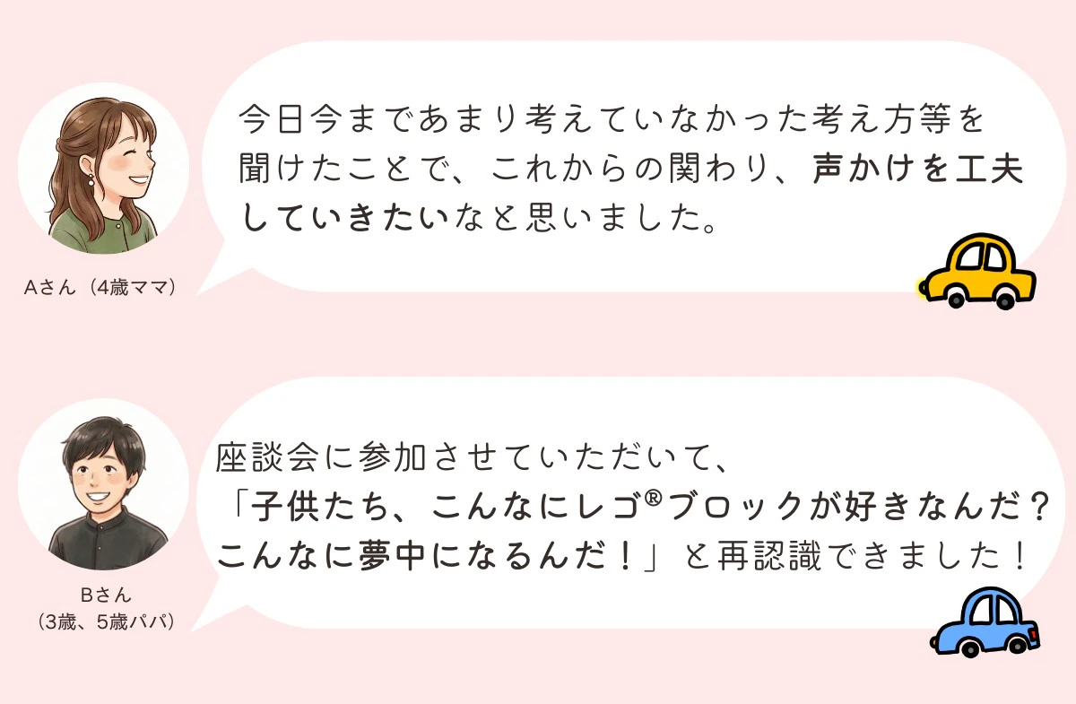 今回の座談会を通して見えてきたのは、ブロック遊びが単なる「遊び」ではなく、「小さな成功体験」を積み重ねる最高のトレーニングだということ。ご参加いただいた親子の皆さま、ありがとうございました! 読者の皆さんもぜひ、ご家庭で「声がけ」試してみてくださいね。