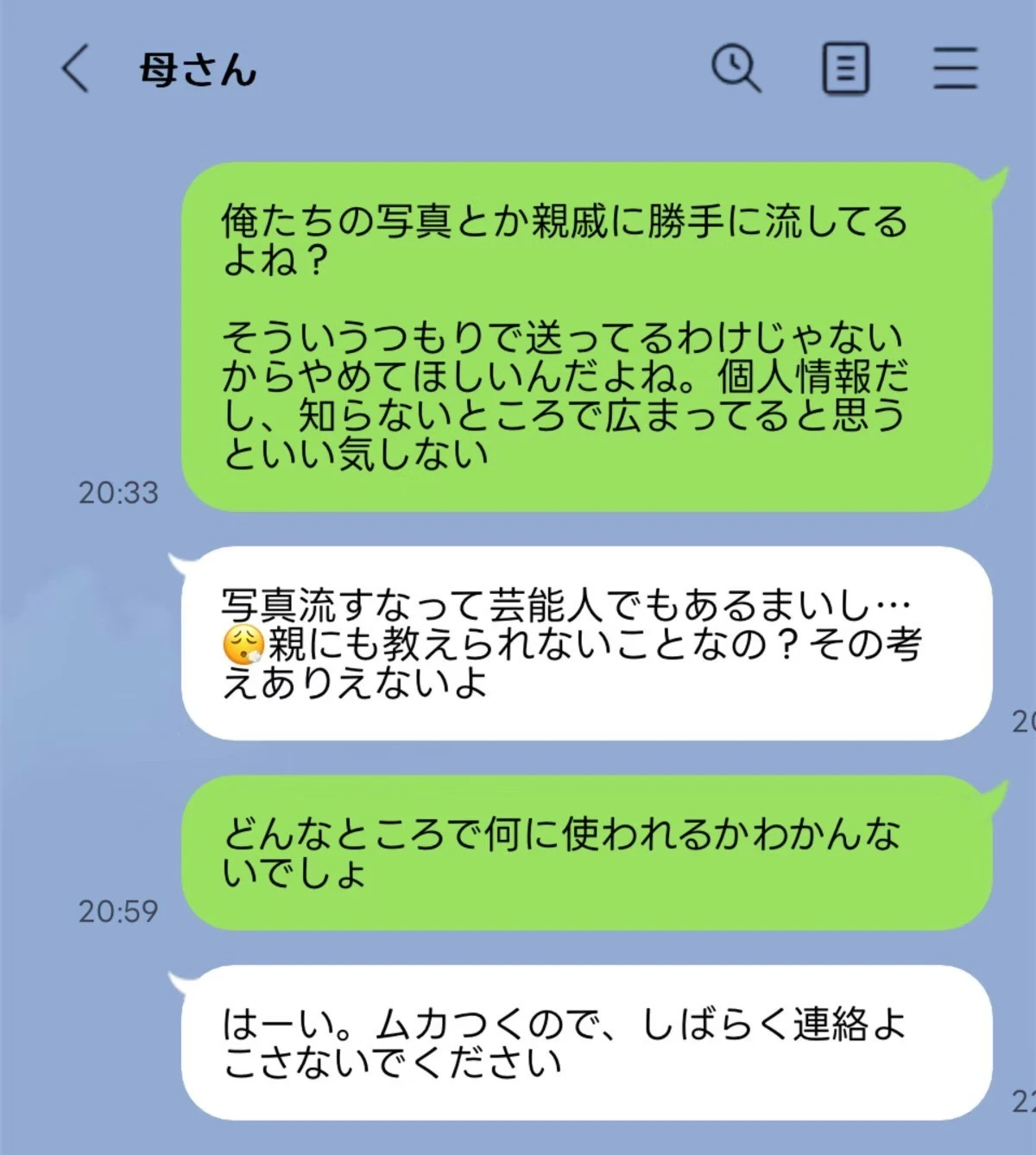 知り得た情報、写真をすぐにあちこちに漏洩するため、嫌な旨を旦那から話すと「(うちの子が)芸能人でもあるまいし、親にも教えられないことなのか!」と激怒、旦那としばらく連絡をとらないなどストライキする。