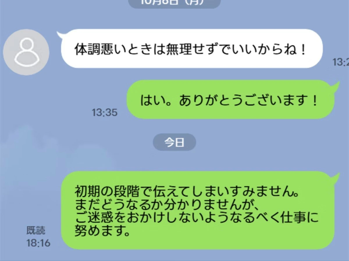 確かに報告してから1回目の生理で妊娠できたので報告は早めになってしまい、初期にも関わらず伝えてしまってどのような反応をすれば良いのかわからなかったかな、申し訳ないことを伝えてしまったかなと思い、その日帰宅後にLINEを送りました。