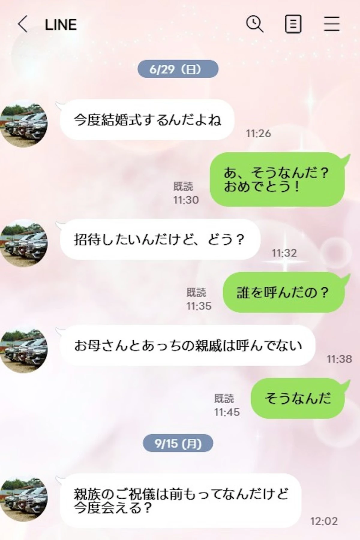 と春ごろLINEが来ており、そこから連絡取ってなかったのですが、9月末に式なのでそろそろ来るかなと思ったら案の定数日前に「会える?」と連絡が来ました。
