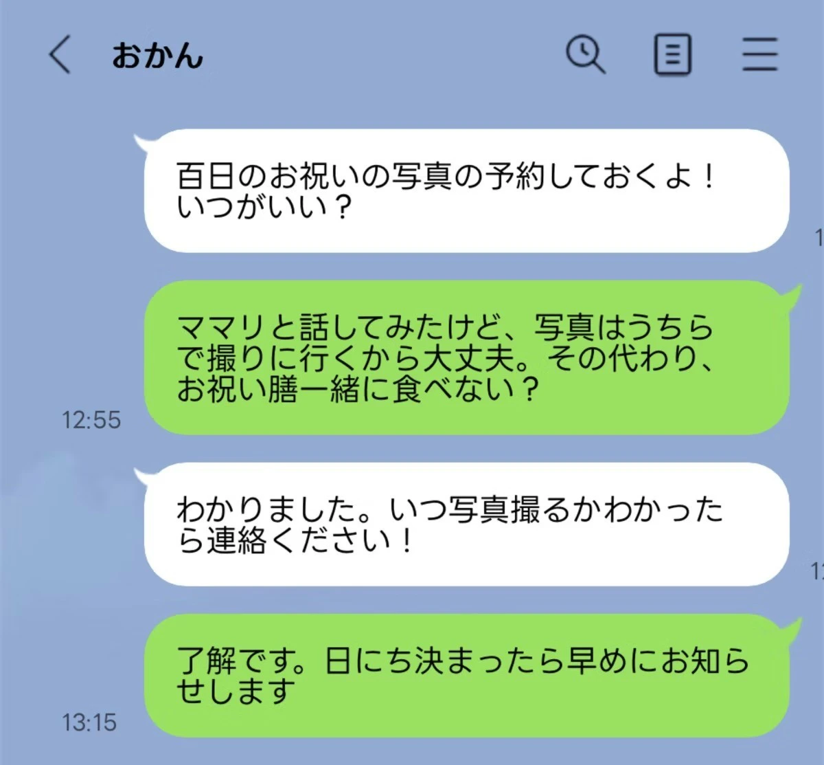 なので写真は自分達でするのでお祝膳なら一緒にどうですかと言ったところ。「分かりました写真はいつ撮るのか撮る日が決まったら教えて」ときました。