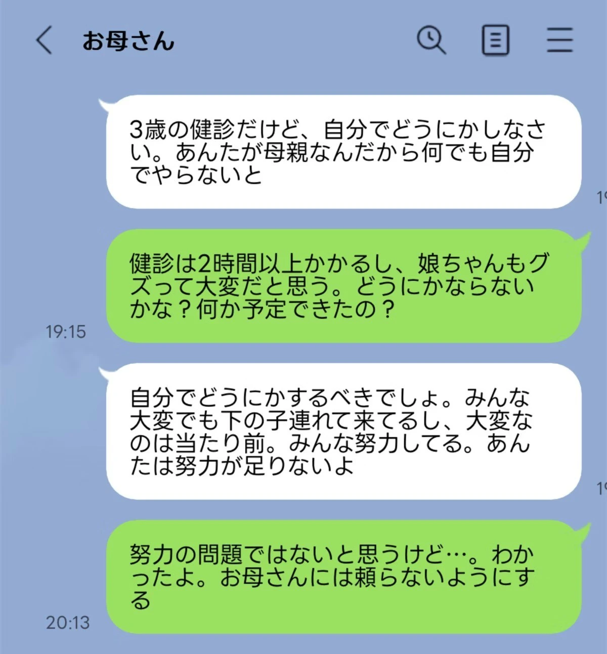 予防接種は二人抱えて行ったものの健診は2時間以上かかるし、さすがに厳しいと思って母に来てほしい旨を伝えたのですがなんで自分でやらないんだ、みんなやってる事なのにお前は努力をしようとしてない、大変なのなんて当たり前だと言われました。