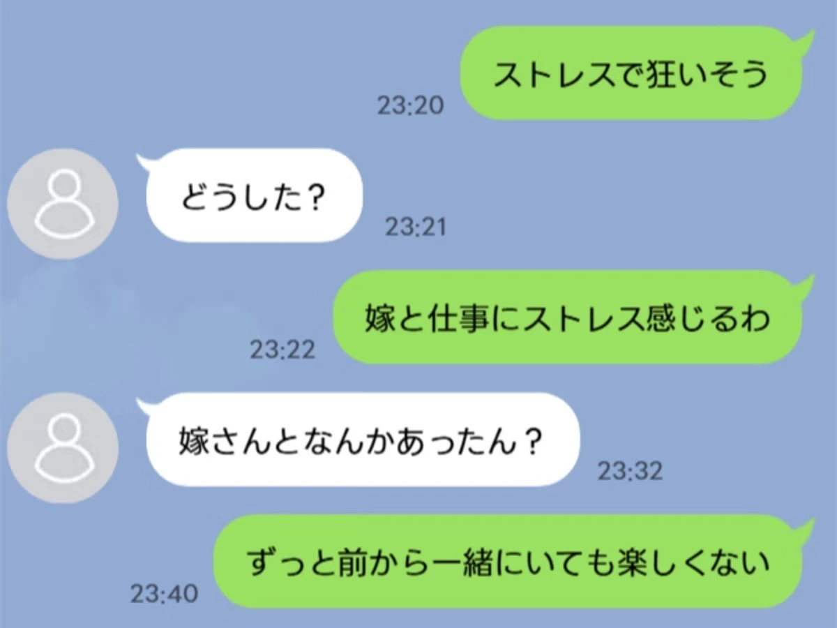 「ストレスで狂いそう」「嫁と仕事にストレス感じる」「ずっと前から一緒にいても楽しくない行動とか性格でイライラする」という内容のLINEをしていました。