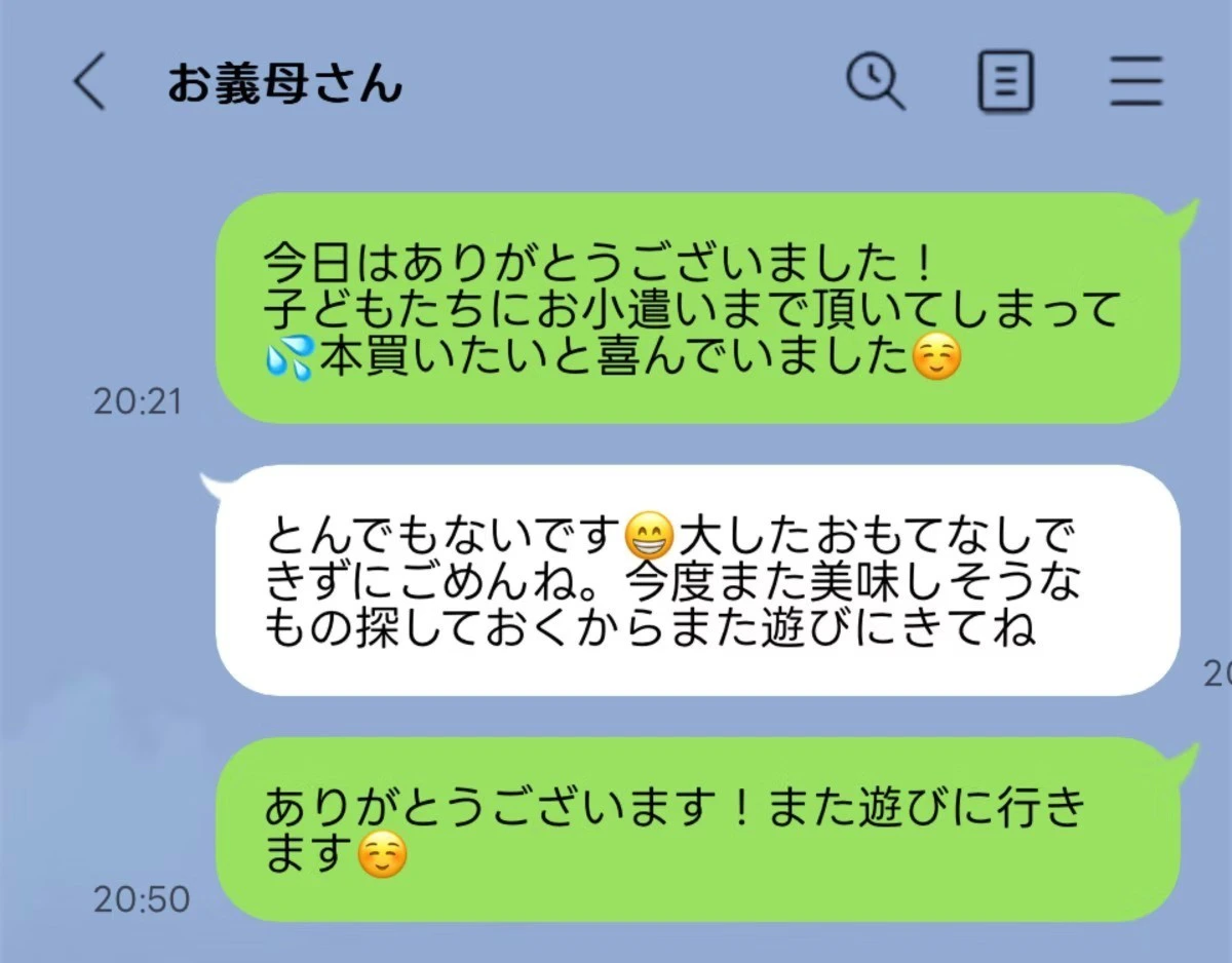義実家はランドセルを買ってくれたり、会う時にはおもてなしをしてくださりますので、お礼を直接も言うし、LINEも送ります。とてもよくしてもらっています。