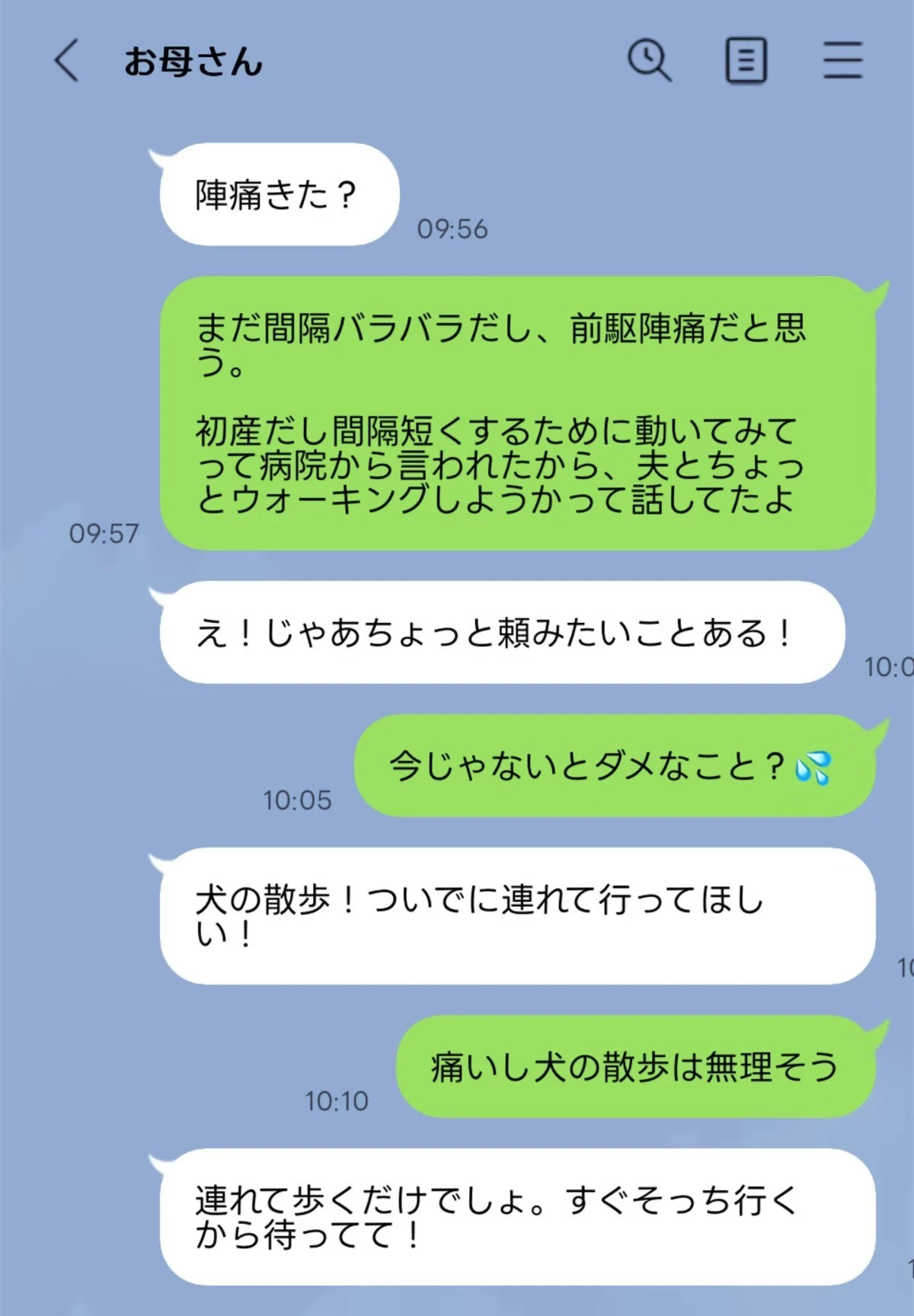 ・前駆陣痛が来ている私に犬の散歩を頼んでくる。