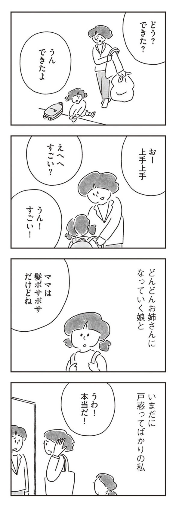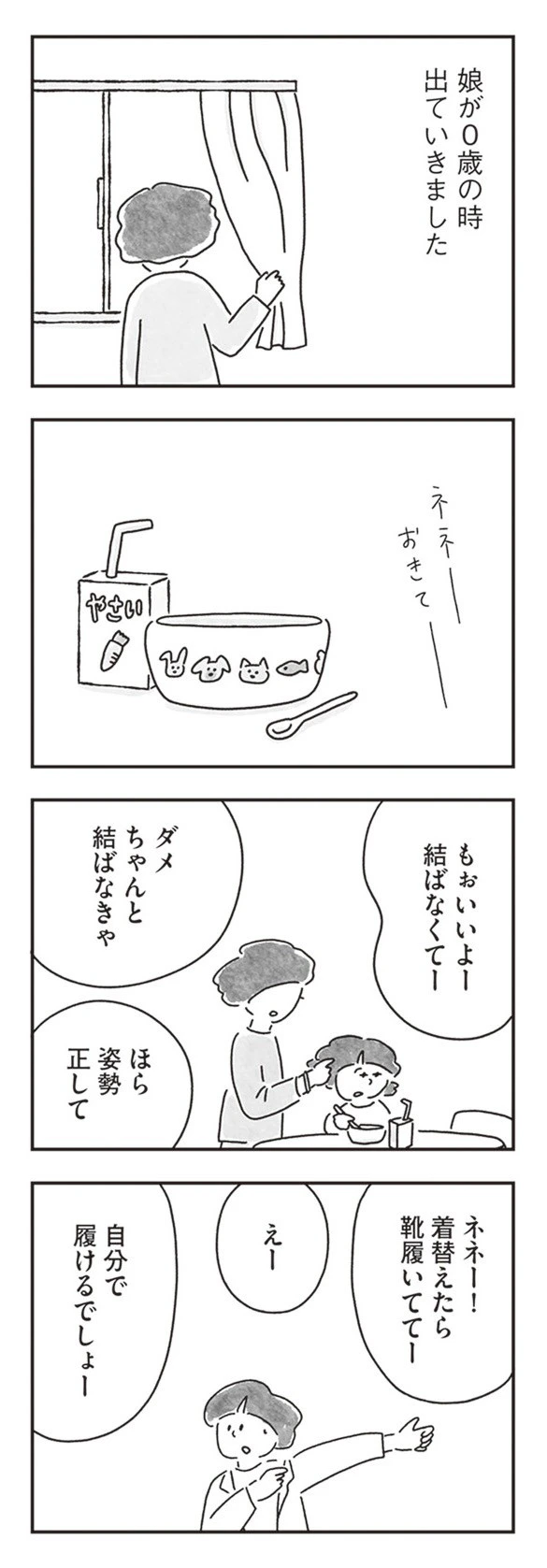 朝は時間との勝負。娘の身支度を整えて自分も仕事へ行く準備をしなければなりません。4歳になった娘にはなるべく自分でできることはお願いしたい。そんな母親の気持ちですね。