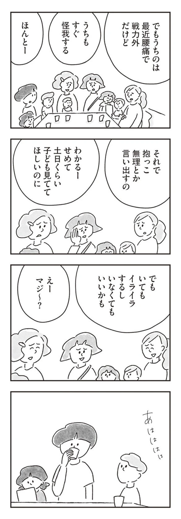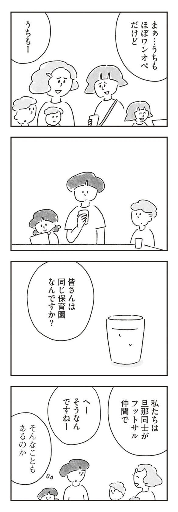 初対面の家族は、どうやら旦那さんがフットサル仲間で仲良くなったようです。その輪に混ぜてもらってのランチタイム。当然、話題は家族の話や夫の愚痴で盛り上がっていきます。ゆみさんにはどれも縁のない話で、ただ静かに聞くしかありませんでした。
