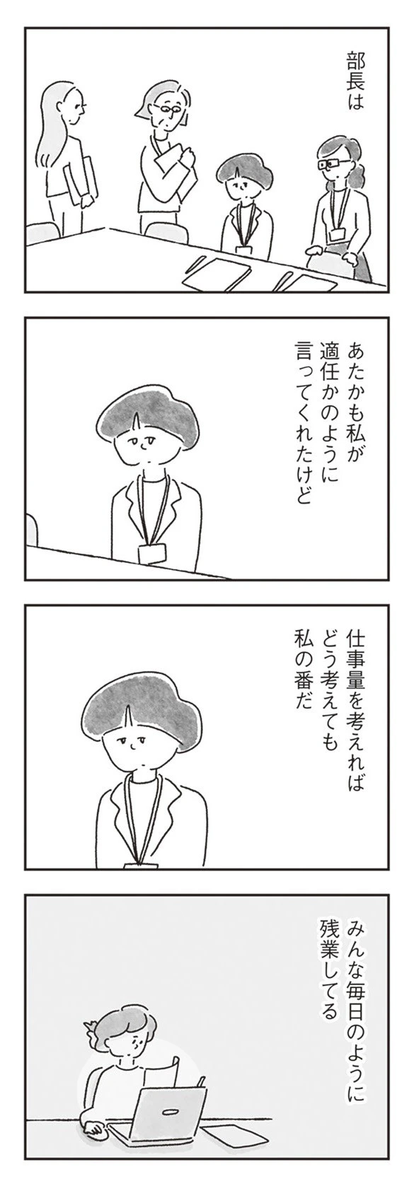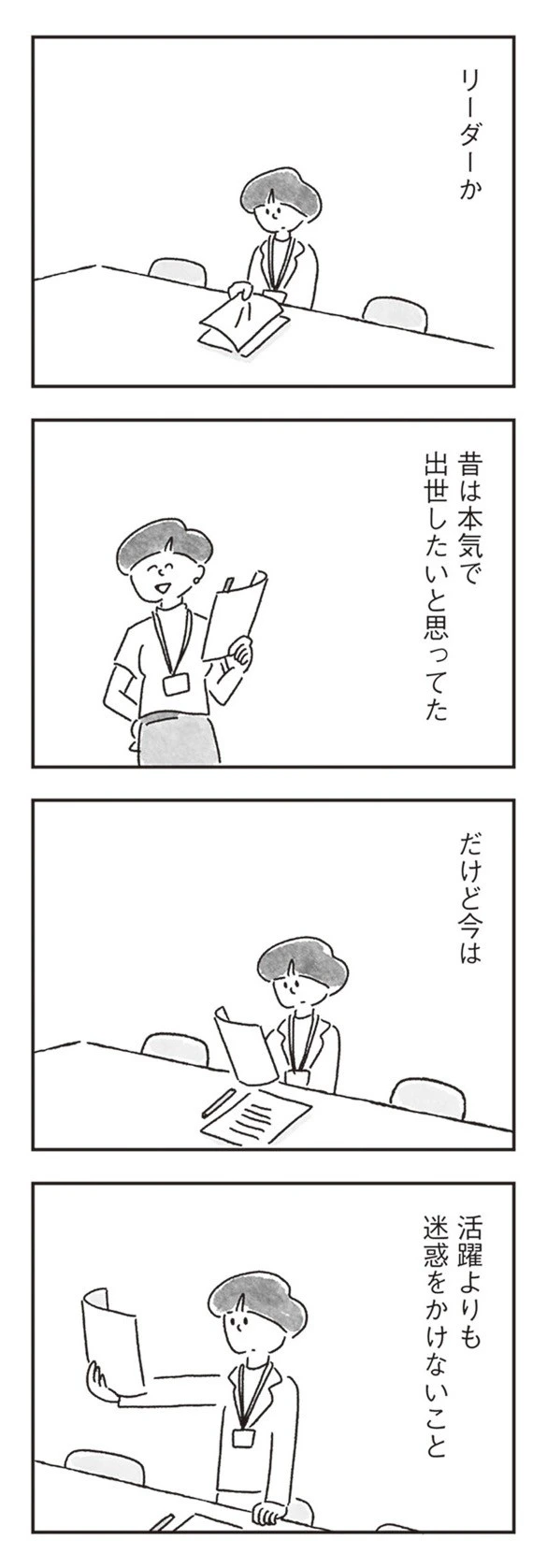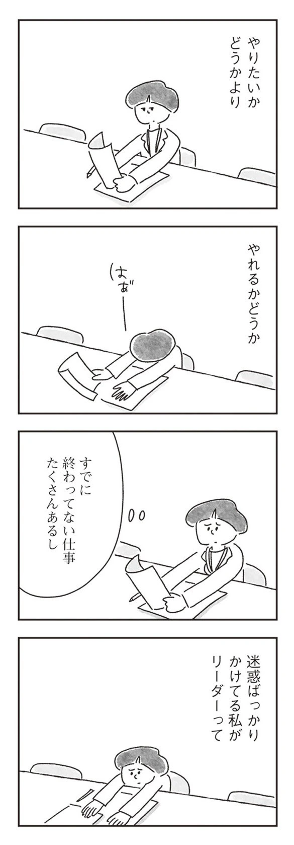 リーダーをやるのは順番的に自分だ——ゆみさんも薄々気づいていました。かつては出世したいと仕事に打ち込んでいたのに、今はなるべく周りに迷惑をかけないようにと働く毎日。そんな自分に、リーダーなんて務まるのだろうか。指名された瞬間、胸の奥で自信がどんどんしぼんでいくのを感じるのでした。
