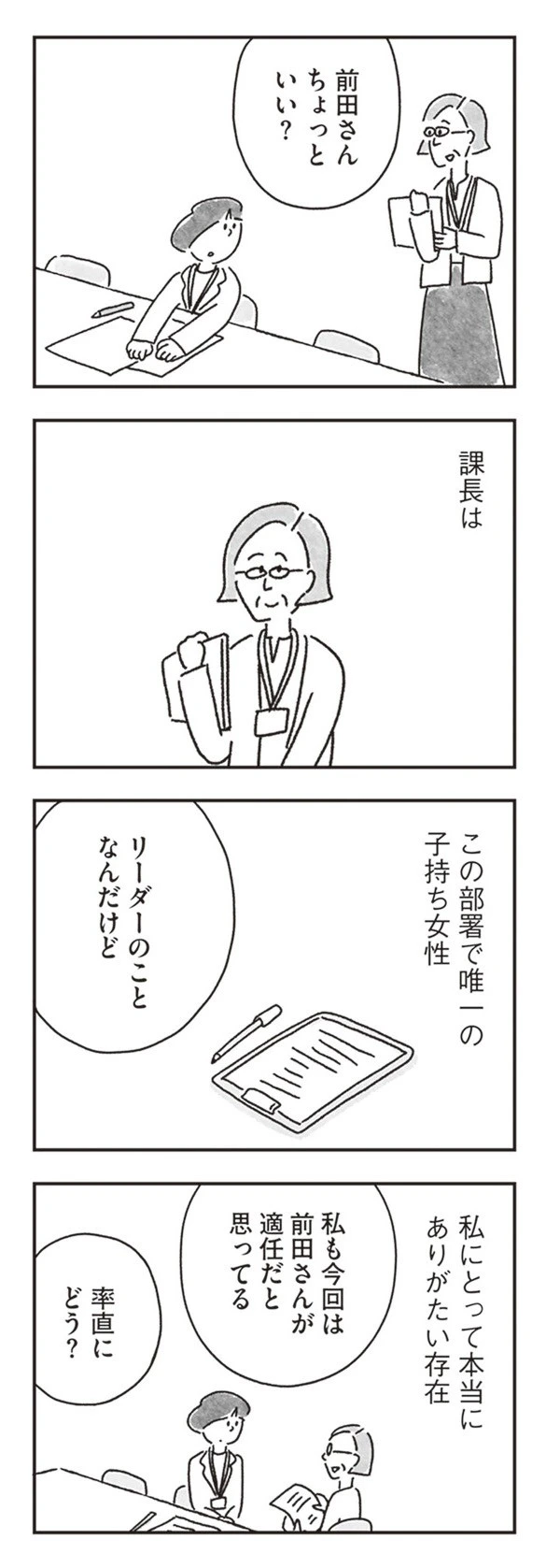 気づけば、理想と現実のあいだでため息がこぼれてしまうゆみさん。終わっていない仕事が山ほどあるのに、プロジェクトリーダーなんて本当に務まるのだろうか——。不安は、時間が経つほど大きくなっていきました。そんなとき、部署で唯一の子持ちである課長がそっと声をかけてきます。「今回のリーダーは、ゆみさんが適任だと思うよ」課長のその言葉を聞いても、ゆみさんの胸のざわつきはまだ収まりません。