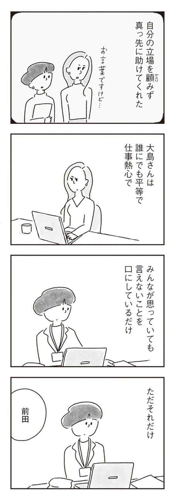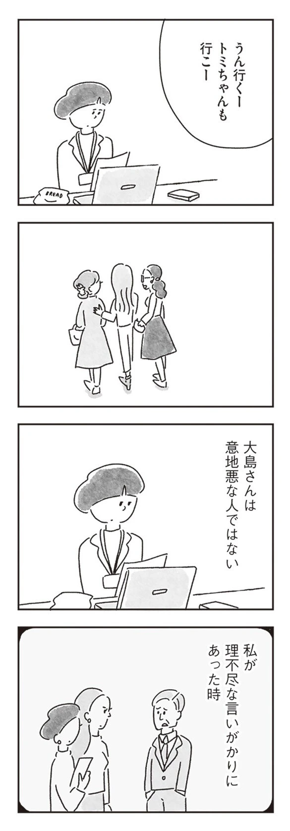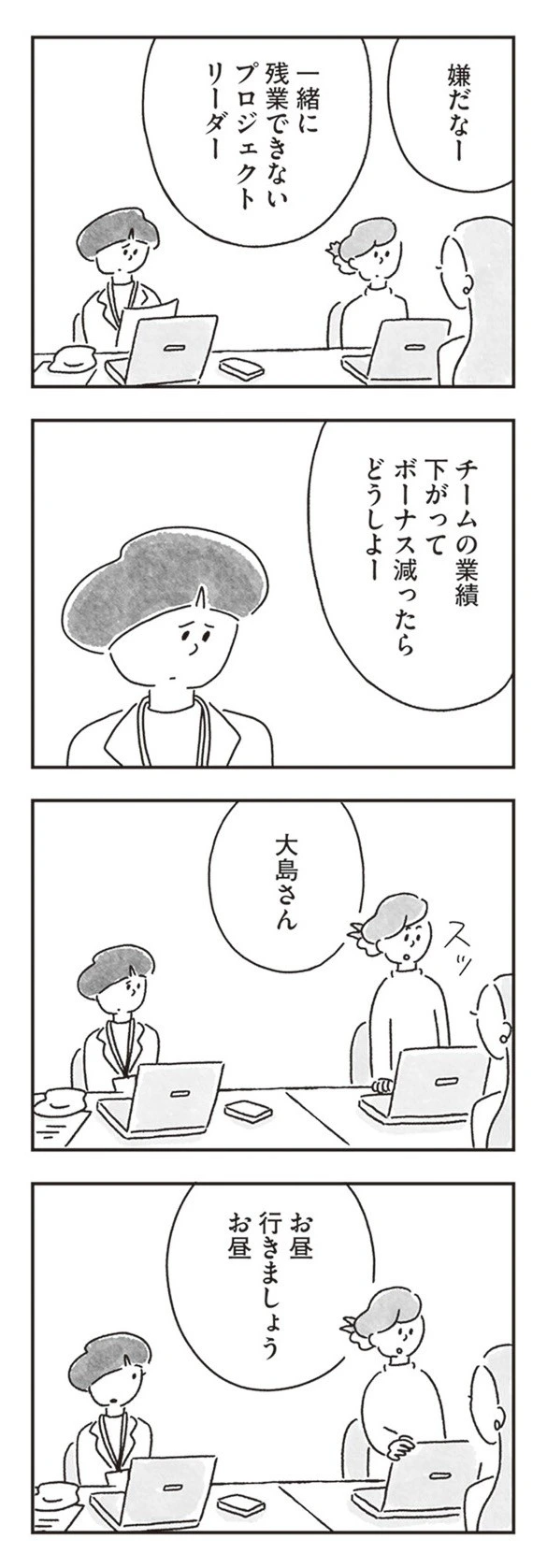 ゆみさんの仕事を手伝おうとしてくれた同僚を見た途端、大島さんは「嫌だなー」と嫌味のような言葉を投げてきました。空気が少し重くなったのを察したのか、別の同僚が気を使ってお昼ご飯にそっと連れ出してくれます。