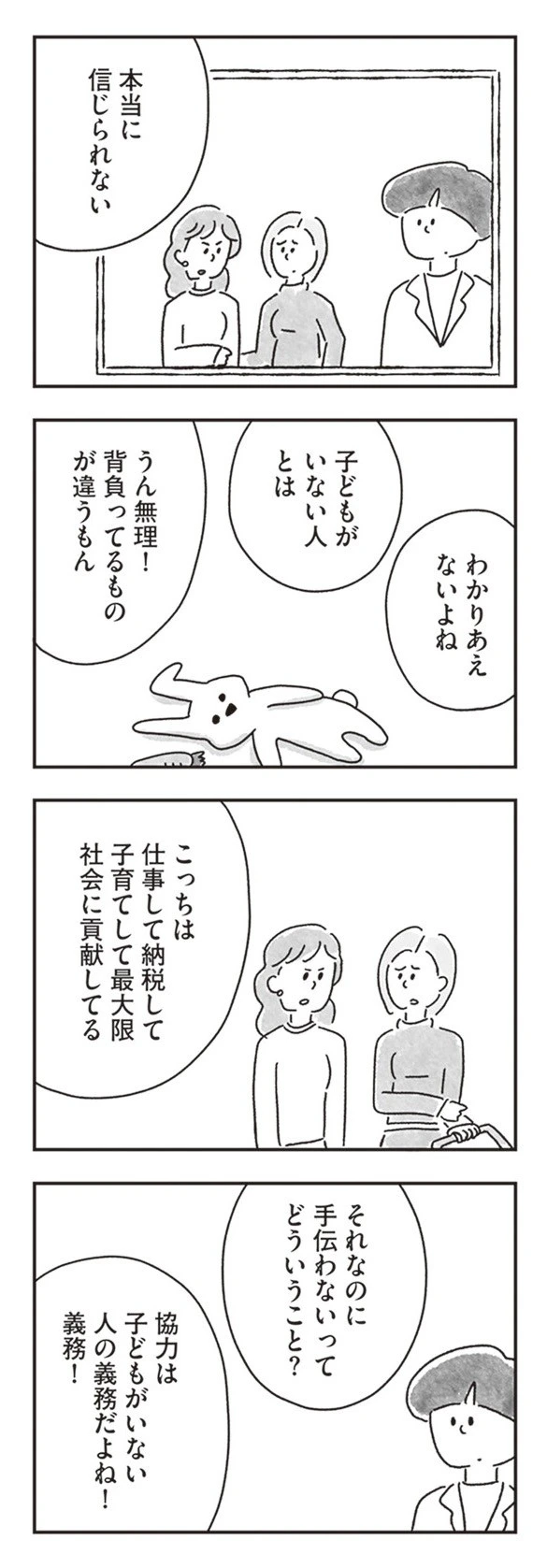 娘の保育園に行くと、ママたちが集まって愚痴をこぼしている場面に出くわしました。「子どもがいる、いないで背負うものが違うよね」「分かり合えないよね」——そんな声が聞こえてきます。
