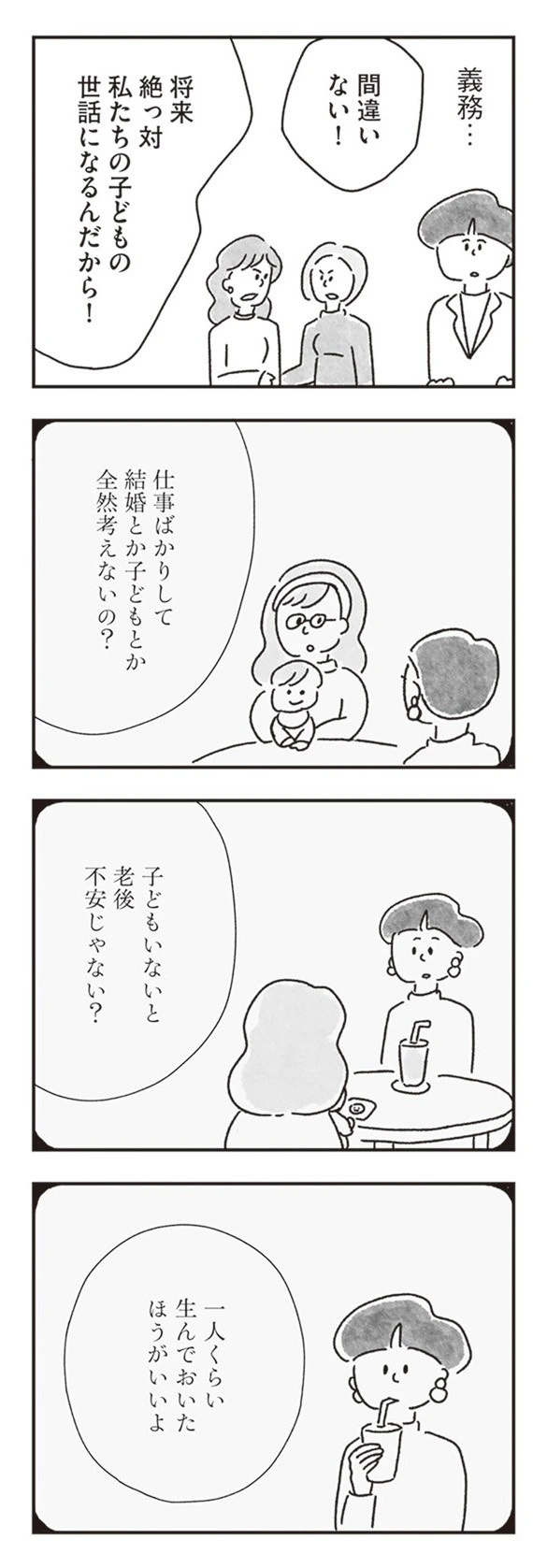 ゆみさん自身も、子どもがいなかった頃は、子持ちの友人から「子どもは1人ぐらい産んでおいたほうがいいよ」と助言されたことがありました。子どもがいる人、いない人、それぞれに違う重さがあって、分かり合えない瞬間もある。みんなが幸せになる方法はないのだろうか——そんな思いが、ふと浮かんでしまうのでした。