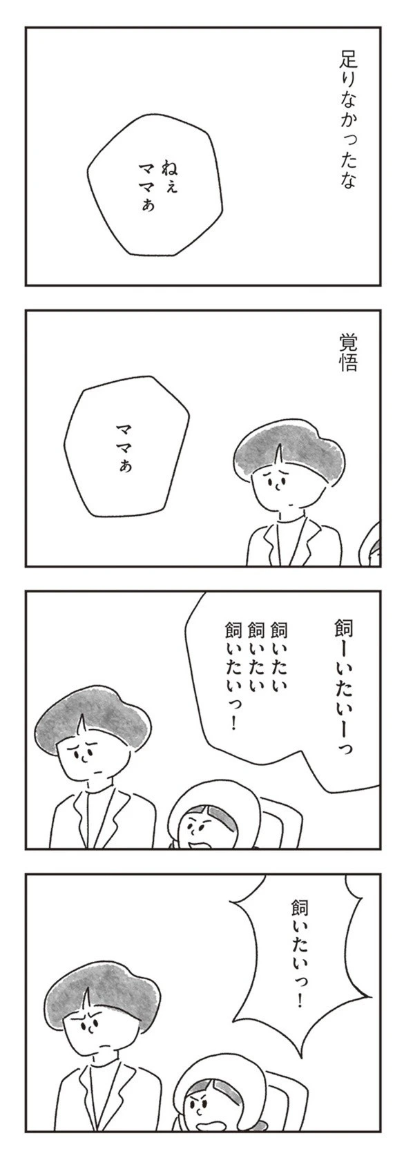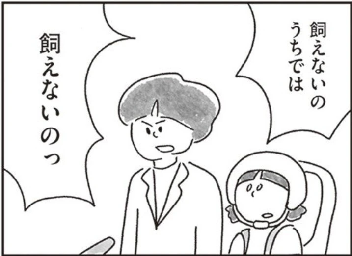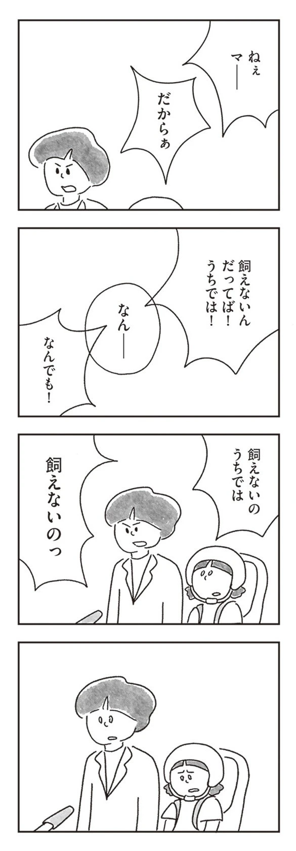 犬を飼いたいと駄々をこねる娘に、ゆみさんは思わず強い口調で「飼えないのっ」と言い放ってしまいました。さっき言われた「パパ」のひと言が、まだ胸の奥でざわついていたのかもしれません。その瞬間、娘はぴたりと静かになってしまいます。ゆみさんの心にも、言い過ぎてしまった後悔がそっと広がっていきました。