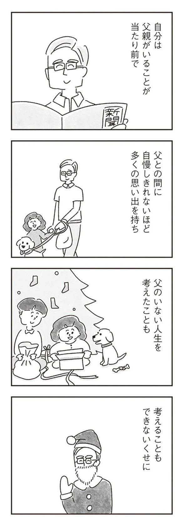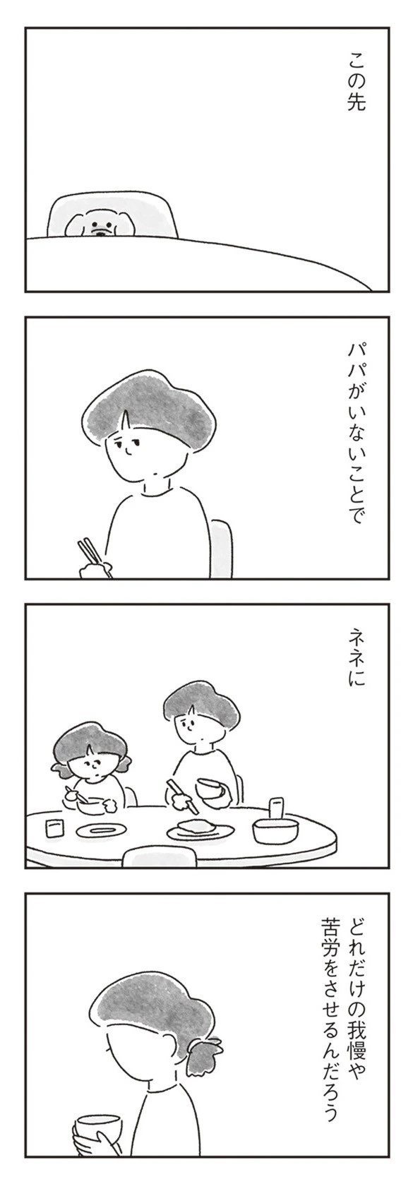 ゆみさんは、自分の幼い頃をふと思い出します。父親との思い出がたくさんあって、守られていた記憶が今も温かく残っています。だからこそ、パパのいない娘のことを思うと、胸がきゅっと切なくなるのでした。