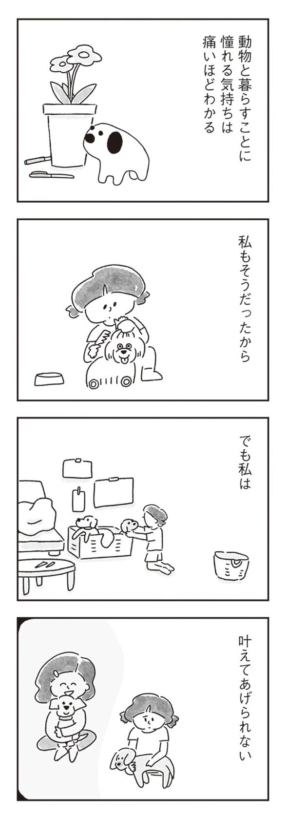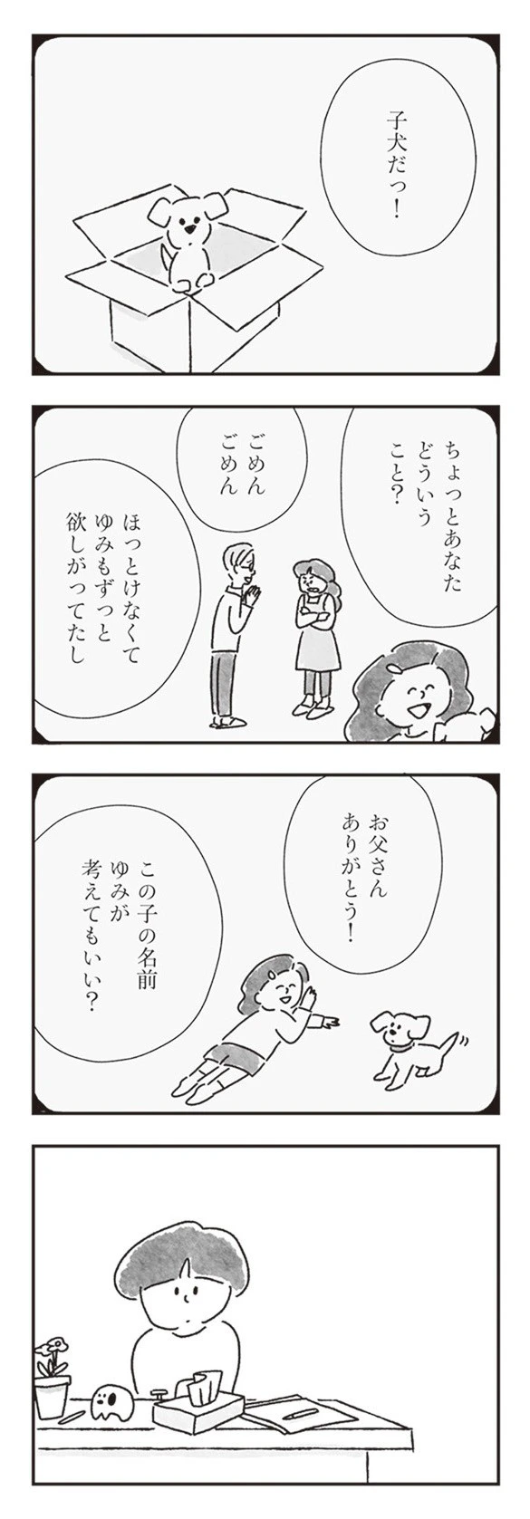 幼い頃、ゆみさんの家には犬がいました。お父さんが拾ってきてくれたその犬は、ゆみさんにとって大切な思い出のひとつです。小さな子にとって、ペットを飼うことは特別な憧れ——それはよくわかっています。