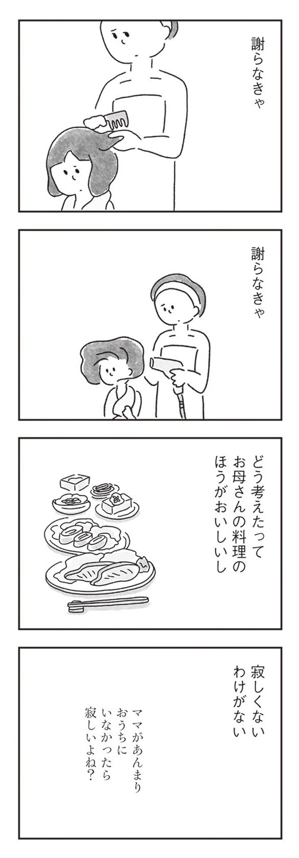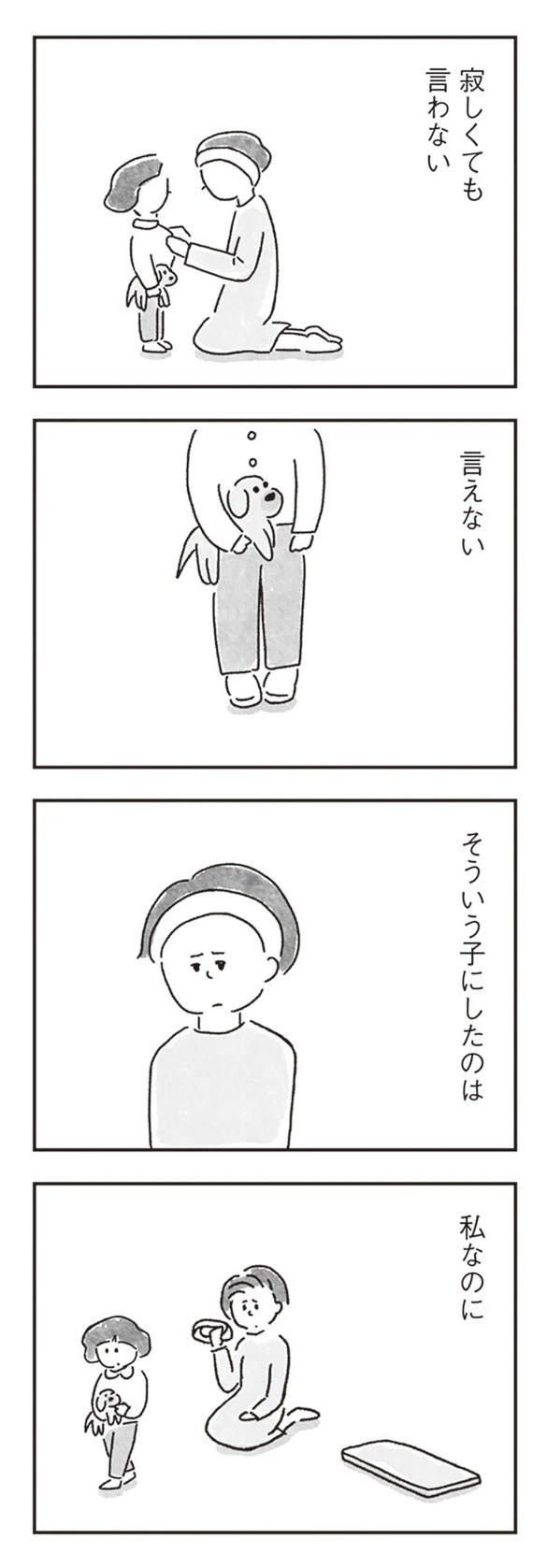 娘は本当は寂しいに決まっている——ゆみさんには、それがわかっています。それなのに、娘は我慢して本当の気持ちを言ってこない。その健気さを知っているからこそ、今回強い口調で言ってしまった自分の言葉が胸に刺さります。黙らせてしまったのは、自分の言い方。わかっているのに、また同じことをしてしまった——。ゆみさんは、娘の沈黙と自分の後悔のあいだで、そっと立ち尽くしていました。