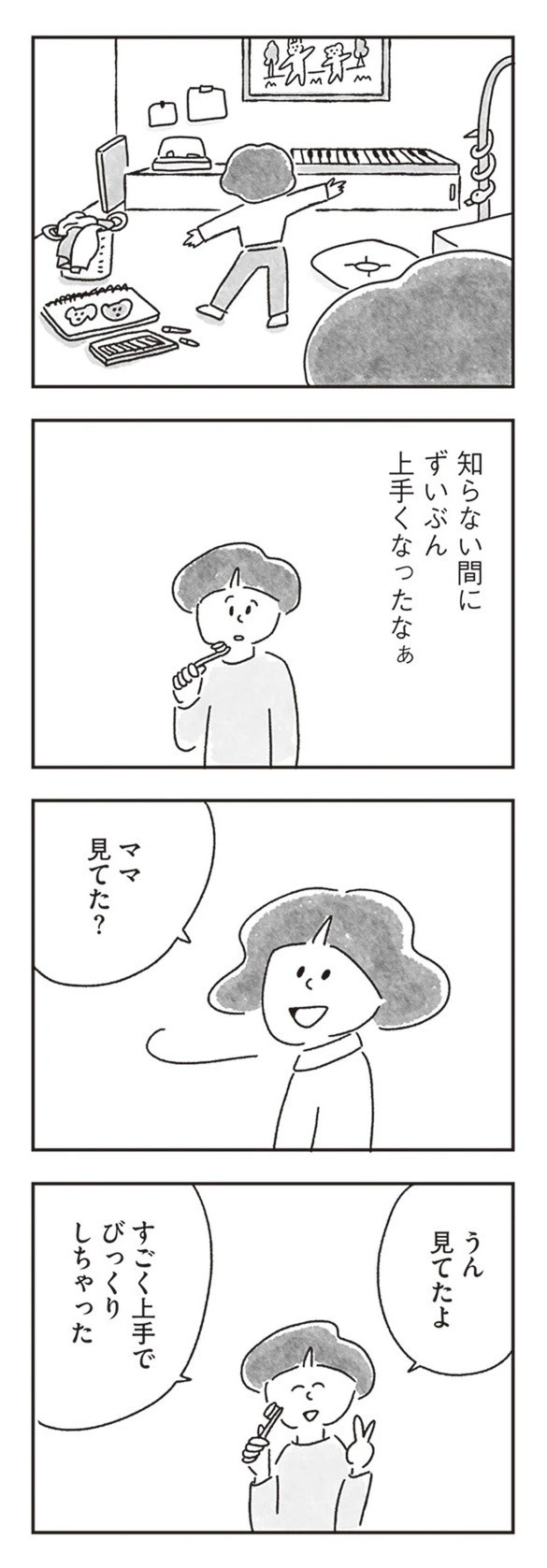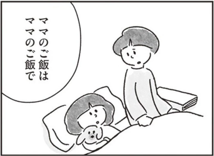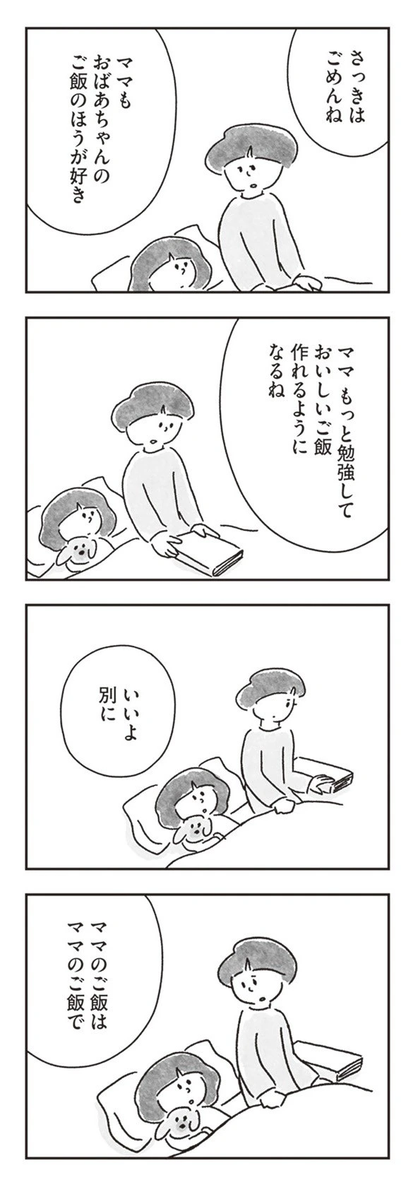 お風呂での出来事をゆみさんが謝ると、娘は「別にいいよ」とあっさり許してくれました。そのあと、ご飯のことを気にしていたゆみさんがそっと気持ちを伝えると、娘は迷いなく言います。「ママのご飯は、ママのご飯でいいよ」そのひと言に、ゆみさんはまた救われたのでした。