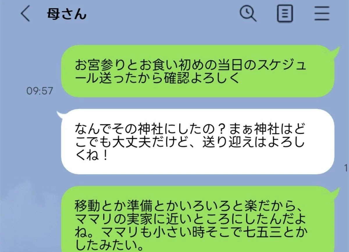 私は実家から近いところに住んでいることもありよく実家には頼らさせてもらっています。そのこともあり私達も行き馴染みのある実家近くの神社へ行くことしその後のお食い初めの料理屋さんも予約しました。当日のスケジュールを旦那から義母へ伝えてもらうと「なぜそこの神社でするのか、送り迎えはしてね」と返事がありました。LINEの内容は見せてもらってませんが旦那曰く「なぜ私が遠くまでいかないといけないのか」と言わんばかりの内容だったそうです。義母はまだ50代前半で普段から運転もしています。当日長丁場になることも考え神社から1番近い実家に旦那と子供と前乗りする予定でした。ですが「送り迎えはしてね」と言われ当初考えていたスケジュールは崩れかけています。旦那から送り迎えはできないことを伝えてはもらったのですが「じゃぁ帰りは送ってね」とまた念押しされたとのことです。勝手に場所を決めたことはこちらにも少しだけ非はあるなと思いますがどこまで図々しいんだと思いました。旦那はもうめんどくさいから帰りだけ送ってくる、と言っています。しかし旦那が出てしまうと私と子が家に帰る手段がありません。また実家へ迎えに行くと言ってくれてますがなぜ私たちがそこまで気を使わないといけないのでしょうか。私としてはそこまでゆーなら別に来てもらわなくて結構なんですが。それともお宮参りの場所を義母よりにすべきだったのでしょうか。