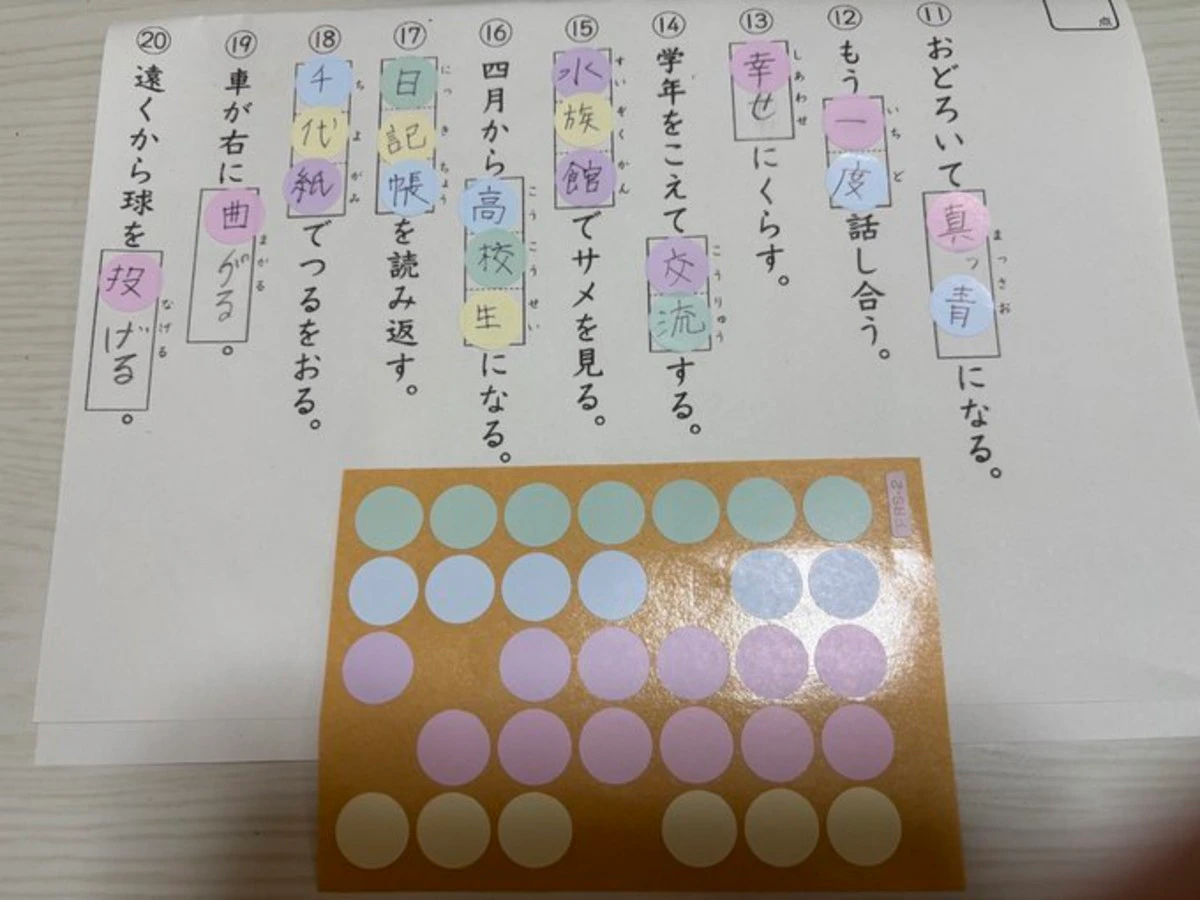 漢字はゼロから形を覚えないといけないところが大変。そこでしらゆきひめさんが使っているのは【丸シール】。漢字をシールに書いて、選択式にしているそうです。これなら漢字が苦手な子も取り組みやすくなりますね。さらにカラフルな丸シールであれば「青のシールにあるよ」と声かけもしやすくて良いアイデアです。
