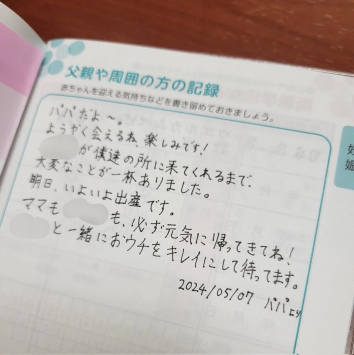母子手帳の「父親や周囲の方」欄に書かれた手紙