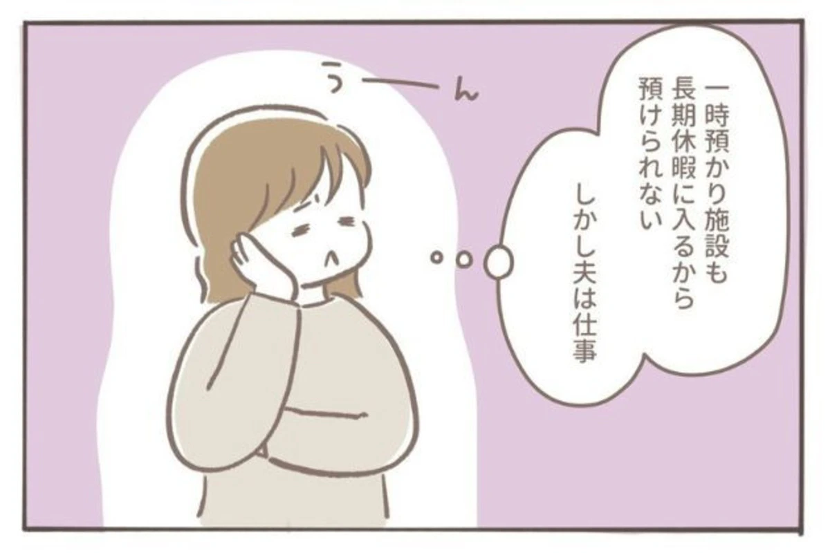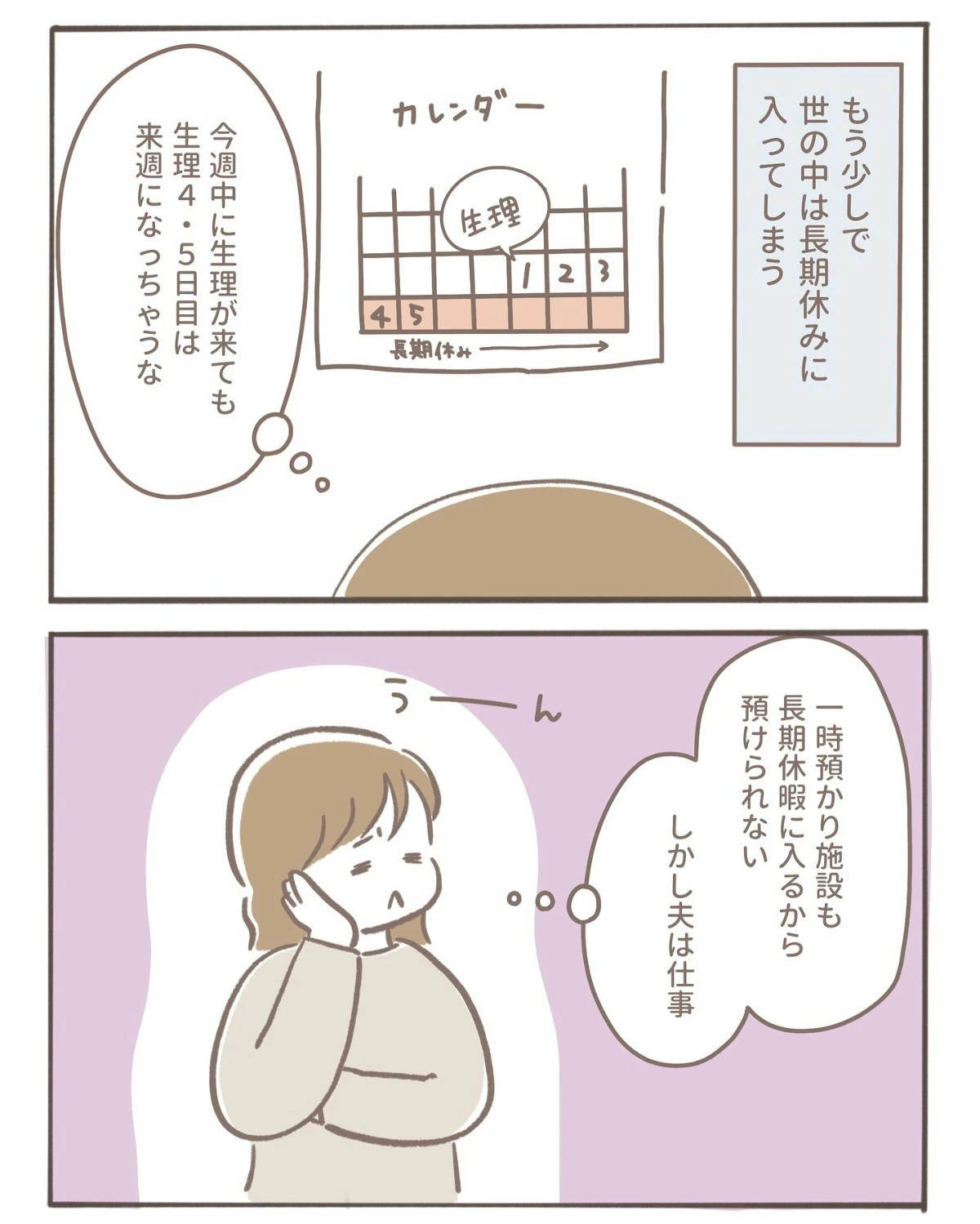 体の不調が理由で、今回は不妊治療を一時中断することに。さらに、タイミングが合わず、体の周期と病院の休みが被ってしまいそうです。また、長期休暇の場合、一時保育も利用できないため、見送るほかありませんでした。