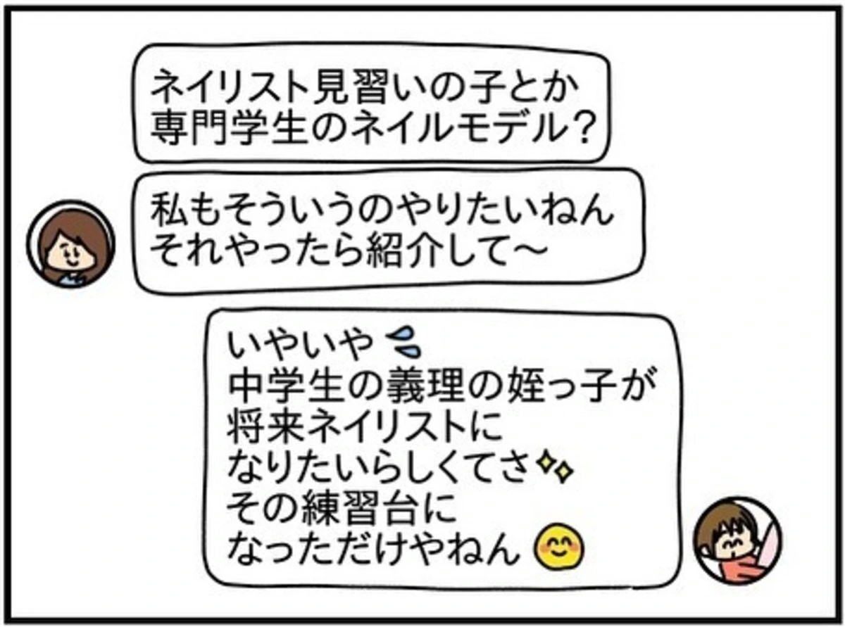 ある日、中学生の姪っ子にしてもらったネイルをSNSにアップした きよかさん。すると、学生時代の友人・チコちゃんから「このサロンを紹介して欲しい」というDMが届きます。そして、相手が中学生だと分かると「練習台になってあげる」と、突然の上から目線…。