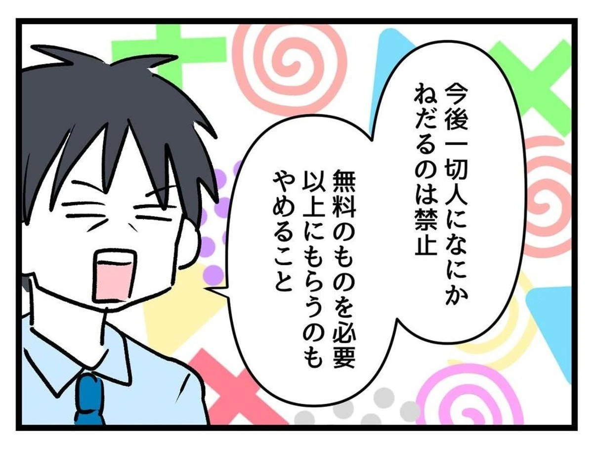 たまみは、普段から他人に対して「ずるい」「ケチ」などと考え、モノをねだって欲しがるクセがついていました。スーパーでの試食をおかわりしたり、無料のビニール袋を大量にもらうことも。そんな母の背中を見て育った娘・まいもまた、常識が歪んでしまったのです。
