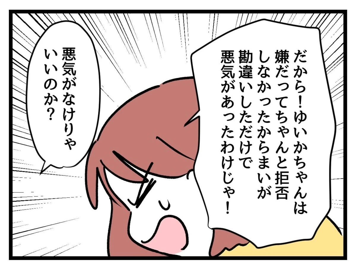 ある日、まいは友だちの家から勝手にネックレスやゲームソフトを持ち帰ります。あくまで「もらった」と主張するまいに対して、ゆいかちゃんは「あげてない」と対立。そしてやはり、まいは「ダメって言われなかった」のを理由に、勝手に持って帰ってきたようです。